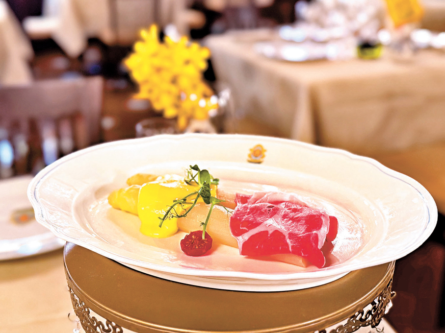至於香港店則推出季節套餐及尊貴套餐,推介前菜包括「水煮白蘆筍配香煎北海道帶子、荷蘭汁及馬齒莧沙律」,將白蘆筍的優雅、北海道帶子的鮮甜與荷蘭汁的奢華奶香融為一體,帶來層次豐富卻輕盈的味覺享受。「白蘆筍墨魚湯」以鮮活墨魚與白蘆筍慢火熬煮,口感絲滑濃郁。星級主菜有「澳洲和牛牛柳配黑松露汁及米蘭式炸白蘆筍」,頂級澳洲和牛牛柳素來是主廚得心應手之作,外焦內嫩,淋上黑松露汁更顯芳香,旁邊搭配經典米蘭式炸法處理的白蘆筍,口感金黃酥脆。主廚巧思更見於創意甜品:「白蘆筍雪糕配魚子醬、橄欖油及可可脆片」注入細膩清新的靈魂,帶有淡淡甘甜的蔬菜香氣,鹹甜、脆滑、冷熱交織,是別樹一格的饗宴壓軸之作。如經網上訂座後再致電餐廳,可免費升級甜品,並可在甜品上寫上祝福字句。