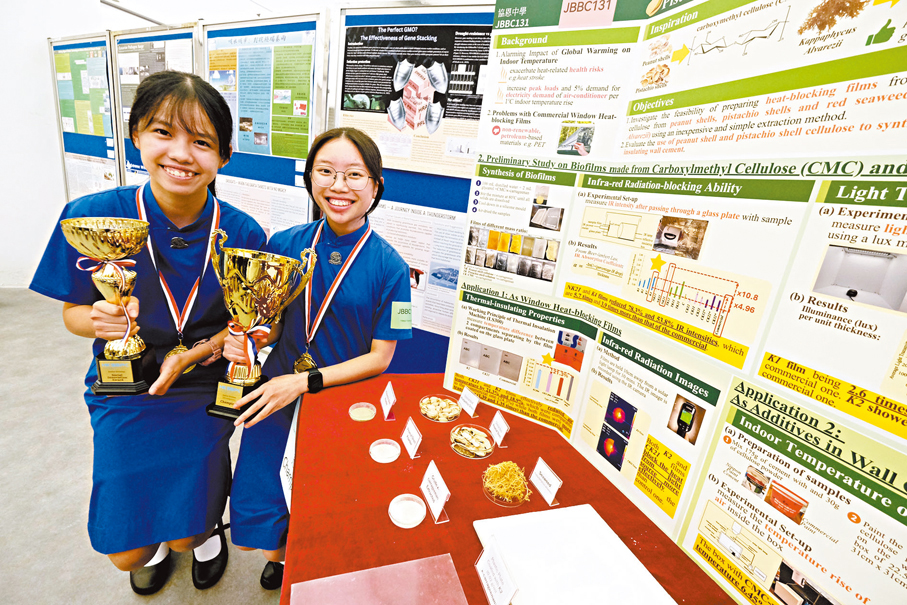 協恩中學的「金窗玉果」勇奪初中組研究項目冠軍。隊員彭同學和葉同學表示,她們發現花生及開心果的果殼有纖維素,以及紅海藻中的卡拉膠具備隔熱能力,其結構能鎖住空氣。若將纖維素加入水泥製成隔熱塗層,能製成天然的隔熱薄膜,有望緩解全球暖化帶來的室內升溫問題,「近年開心果在全球大受歡迎,食用量上升,令開心果殼廢物大增,我們希望善用這類食物廢料,故開展了這項研究。雖然中三的知識層面上,課本未必涵蓋這些內容,但我們為項目專門做了深入研究,證實這些結構確實能發揮隔熱作用。」
