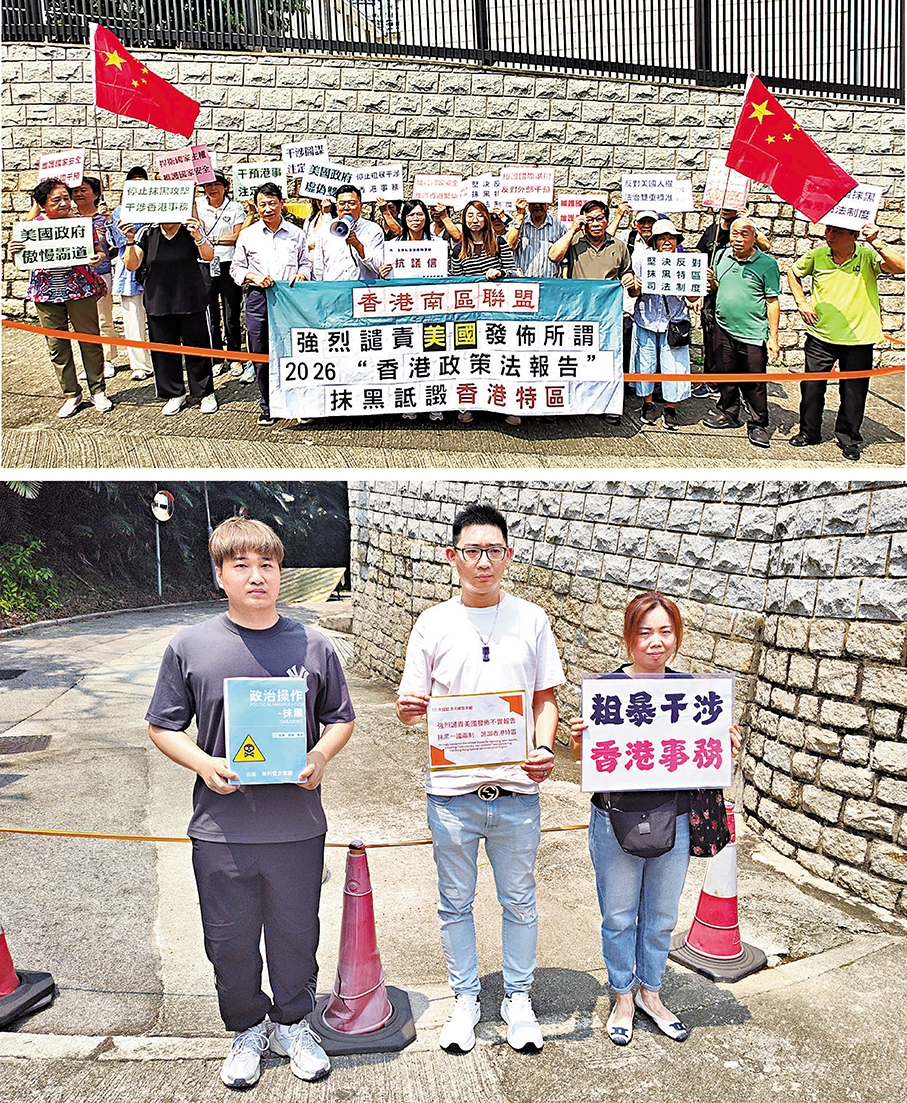 香港文匯報訊(記者 嚴鍇華)美國近日發表所謂2026年「香港政策法報告」,其中刻意顛倒是非,污衊抹黑香港特區,引起全城憤怒。多位香港市民及團體昨日到美國駐港總領事館外抗議,批評美國試圖詆毀「一國兩制」,抹黑香港國安法與法治人權,以卑劣政治操弄妄圖干預香港特區政府依法施政,充分暴露美國霸道嘴臉和「以港遏華」險惡用心,他們對此表示強烈不滿和堅決反對。