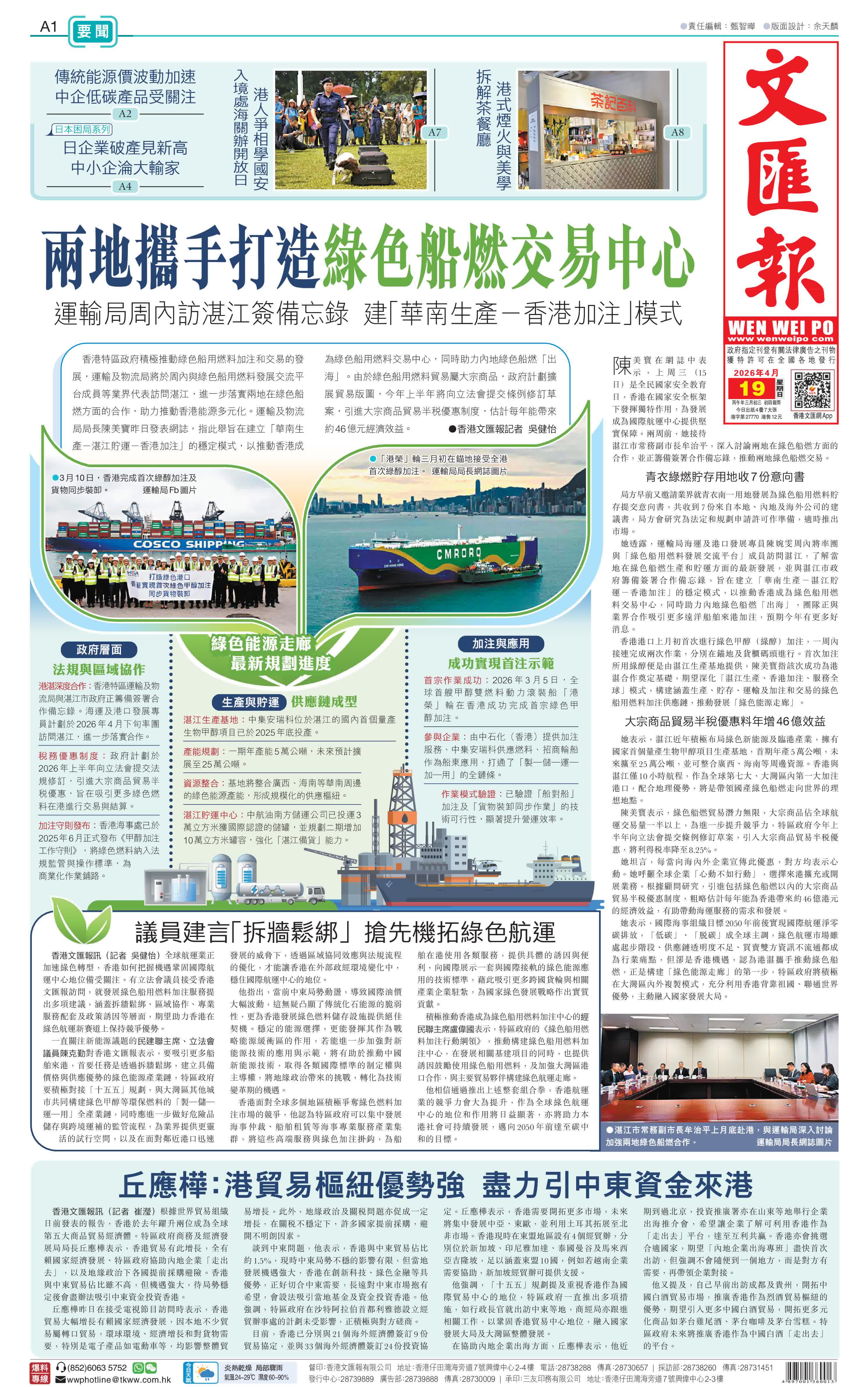 她透露,運輸局海運及港口發展專員陳婉雯周內將率團與「綠色船用燃料發展交流平台」成員訪問湛江,了解當地在綠色船燃生產和貯運方面的最新發展,並與湛江市政府籌備簽署合作備忘錄,旨在建立「華南生產-湛江貯運-香港加注」的穩定模式,以推動香港成為綠色船用燃料交易中心,同時助力內地綠色船燃「出海」,團隊正與業界合作吸引更多遠洋船舶來港加注,預期今年有更多好消息。
