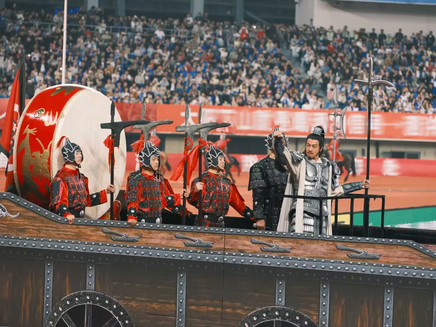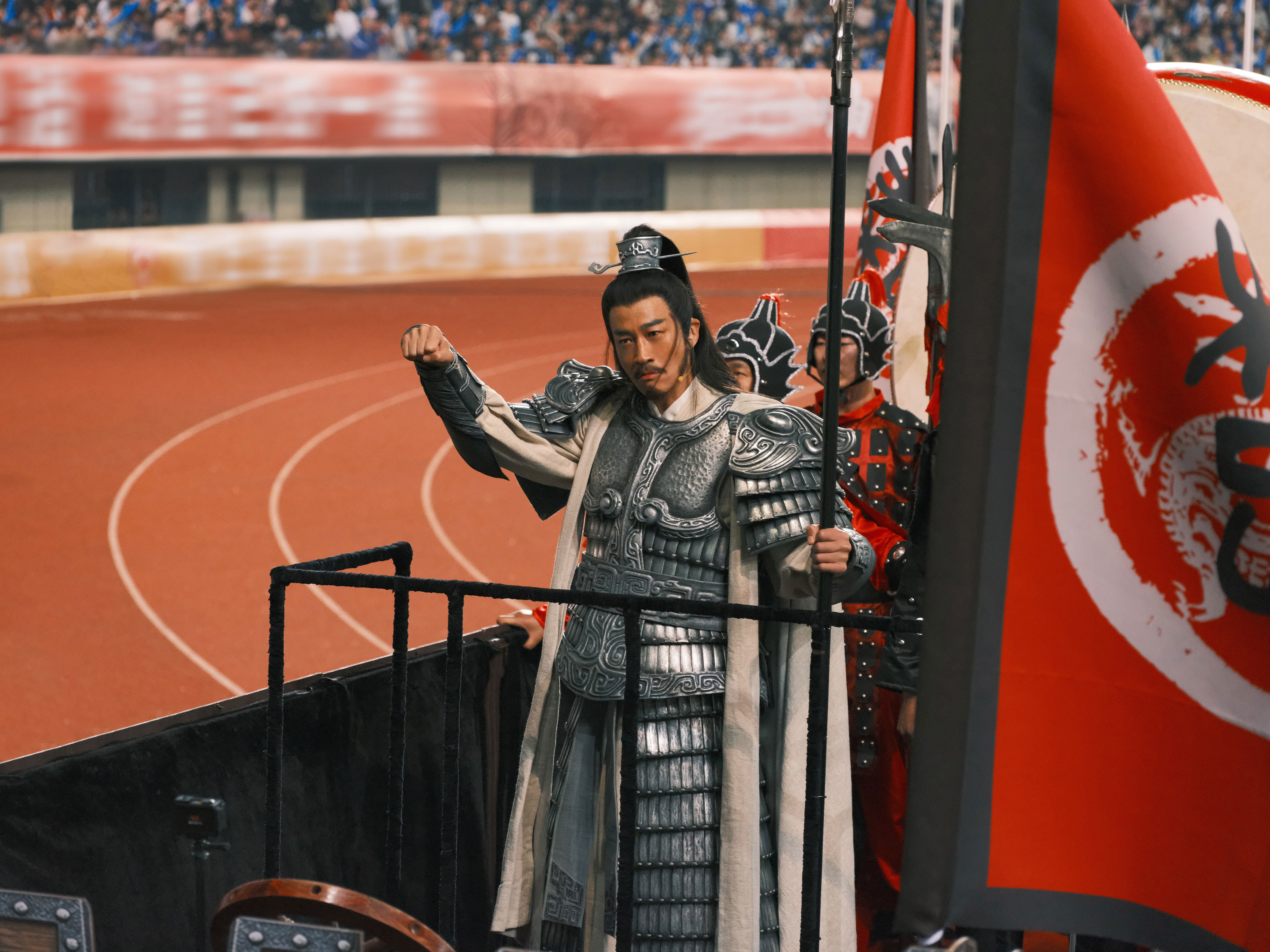 當日晚上的亮相環節,隨着「吾乃西楚霸王項羽!」的聲音透過擴音器傳遍奧體中心,何潤東一句「我項羽回來了!」瞬間點燃全場氣氛,看台上近3萬名觀眾齊聲回應「霸王回歸!」,聲浪一波高過一波。隨後,他復刻項羽的經典語氣高聲發問:「宿遷男兒不輸任何人!敢不敢拚?」觀眾席隨即響起山呼海嘯般的「敢!」,立體環繞的吶喊聲回蕩全場。