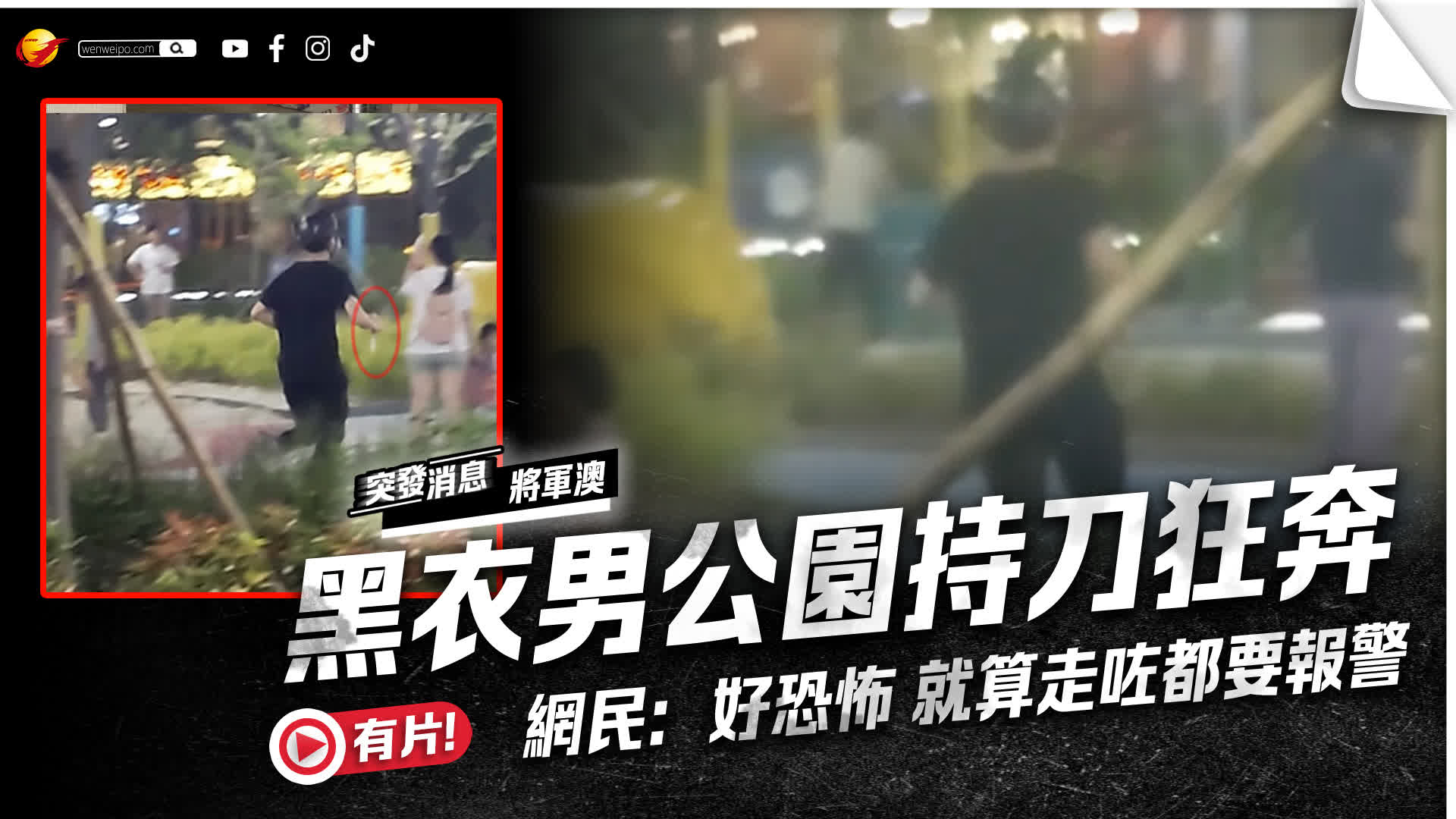上載片段的網民留言:「澳南公園剛有戴頭盔,頭盔有前Cam青少年,手拿超長利器:剪刀/刀狂跑,請各位大人小朋友多多小心」,但沒有交代拍攝的時間和該名持刀男子的去向。