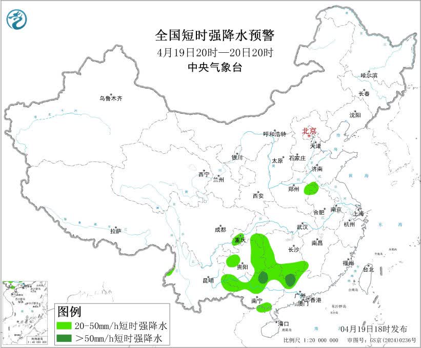 預計,4月19日20時至20日20時,貴州中東部、湖南、廣西北部、重慶中南部、四川東北部等地部分地區有大到暴雨,其中,貴州東部、湖南西部和南部、廣西北部等地局地有大暴雨(100~130毫米)。上述部分地區伴有短時強降水(最大小時降雨量20~50毫米,局地可超過60毫米),局地有雷暴大風或冰雹等強對流天氣。