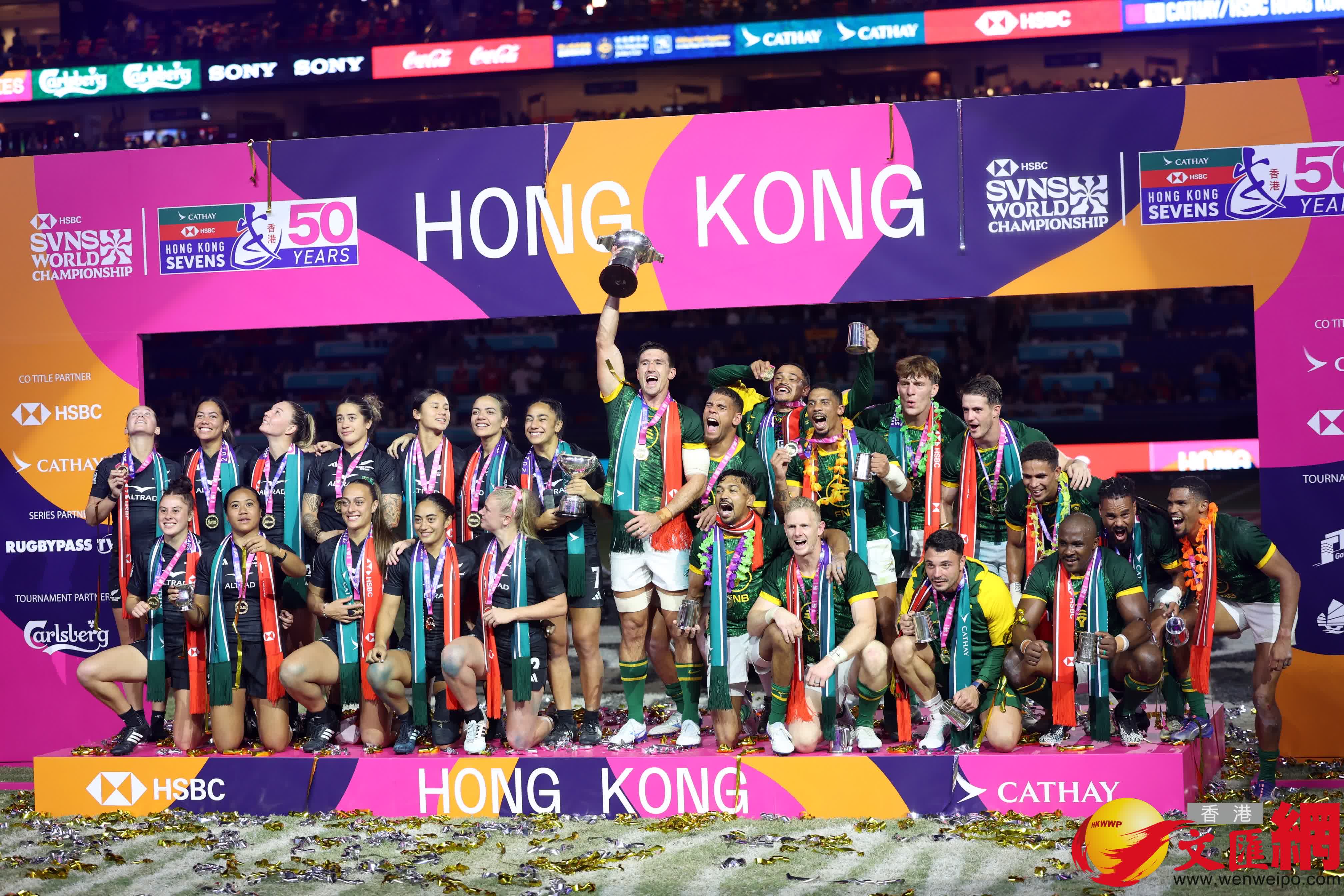 (香港文匯報記者 郭正謙)一連三日的「香港國際七人欖球賽」圓滿結束,今天煞科日繼續吸引大批觀眾入場欣賞賽事,以派對氣氛見稱的南看台人頭湧湧氣氛熾熱,中國香港男子欖球隊於銀劍賽決賽以19:15反勝日本奪冠達成三連霸,而男女子盃賽冠軍則分別由南非及新西蘭奪得。