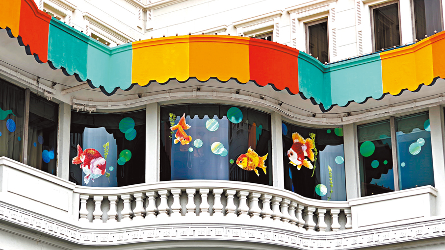 駐足酒店外,伴隨着汩汩噴泉,便能看到許開嬌的裝置藝術作品《粼光遊樂場》;一條條琳瑯的「金魚」彷彿正在氣泡間游動。許開嬌將其與蘇州繡娘探索多年的刺繡金魚,於露台餐廳1樓窗戶展現,同時用高飽和度的塗料為酒店簷篷披上新裝。