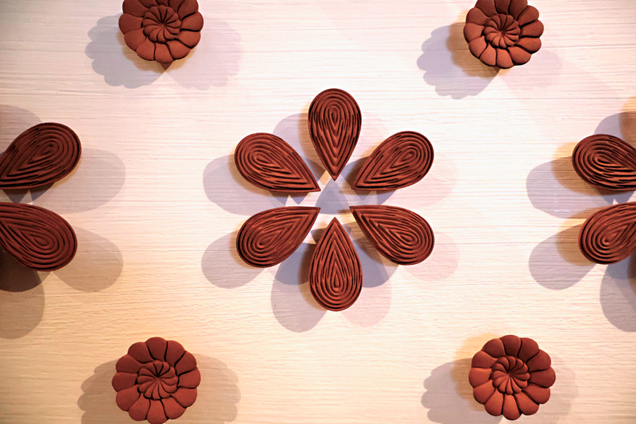 步入大堂,便可見到Albert的《Metamorphic Modulation》。此作品由半島酒店集團與V&A博物館合作籌劃,被置於特製的反射外殼結構中。裝置包含逾七百件陶瓷,它們均以人手塑形,採用紅陶注漿技法鑄造,留有素燒質感,造型與花朵和葉片呼應。