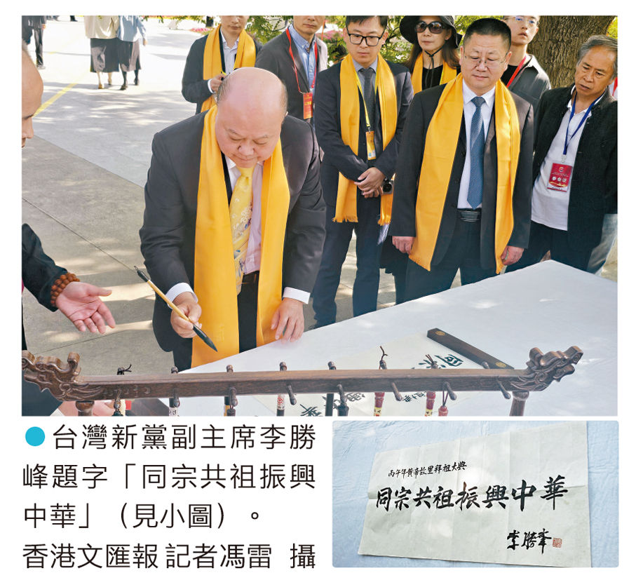 香港文匯報訊(記者 馮雷、劉蕊 河南報道)4月19日,農曆三月初三,丙午年黃帝故里拜祖大典在河南鄭州新鄭黃帝故里舉行。參加本屆拜祖大典的台灣新黨副主席李勝峰題字「同宗共祖振興中華」,並向黃帝像敬香禮拜。參與同場活動的香港特區民政及青年事務局局長麥美娟表示,再次參與這場全球華人尋根的文化盛會,感受極為深刻,年輕群體的積極參與更讓她對文化傳承充滿信心,同時表示未來將推動更多香港青年走進中原,在沉浸式體驗中厚植民族認同。