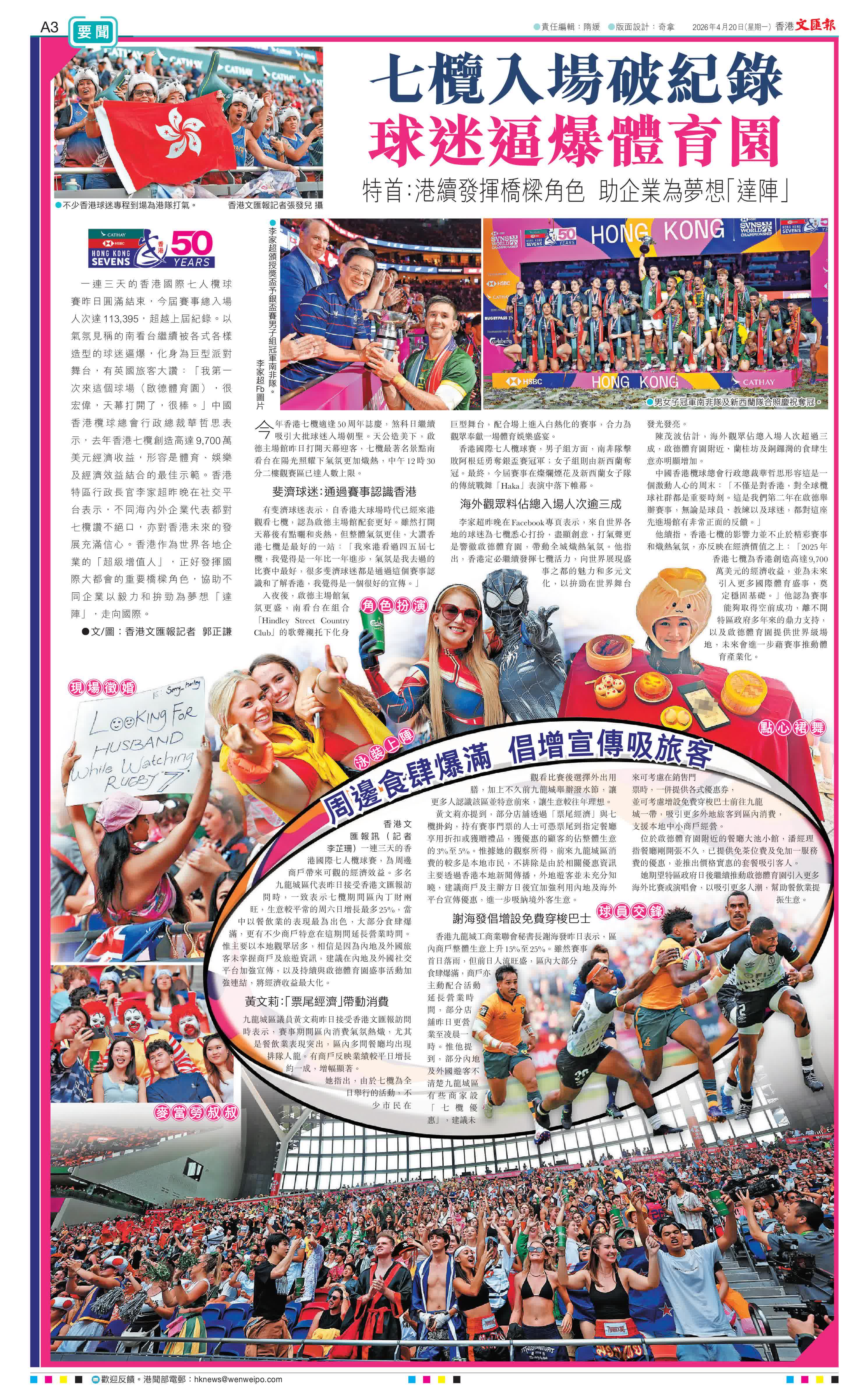(香港文匯報記者 郭正謙)一連三天的香港國際七人欖球賽昨日圓滿結束,今屆賽事總入場人次達113,395,超越上屆紀錄。以氣氛見稱的南看台繼續被各式各樣造型的球迷逼爆,化身為巨型派對舞台,有英國旅客大讚:「我第一次來這個球場(啟德體育園),很宏偉,天幕打開了,很棒。」中國香港欖球總會行政總裁華哲思表示,去年香港七欖創造高達9,700萬美元經濟收益,形容是體育、娛樂及經濟效益結合的最佳示範。香港特區行政長官李家超昨晚在社交平台表示,不同海內外企業代表都對七欖讚不絕口,亦對香港未來的發展充滿信心。香港作為世界各地企業的「超級增值人」,正好發揮國際大都會的重要橋樑角色,協助不同企業以毅力和拚勁為夢想「達陣」,走向國際。