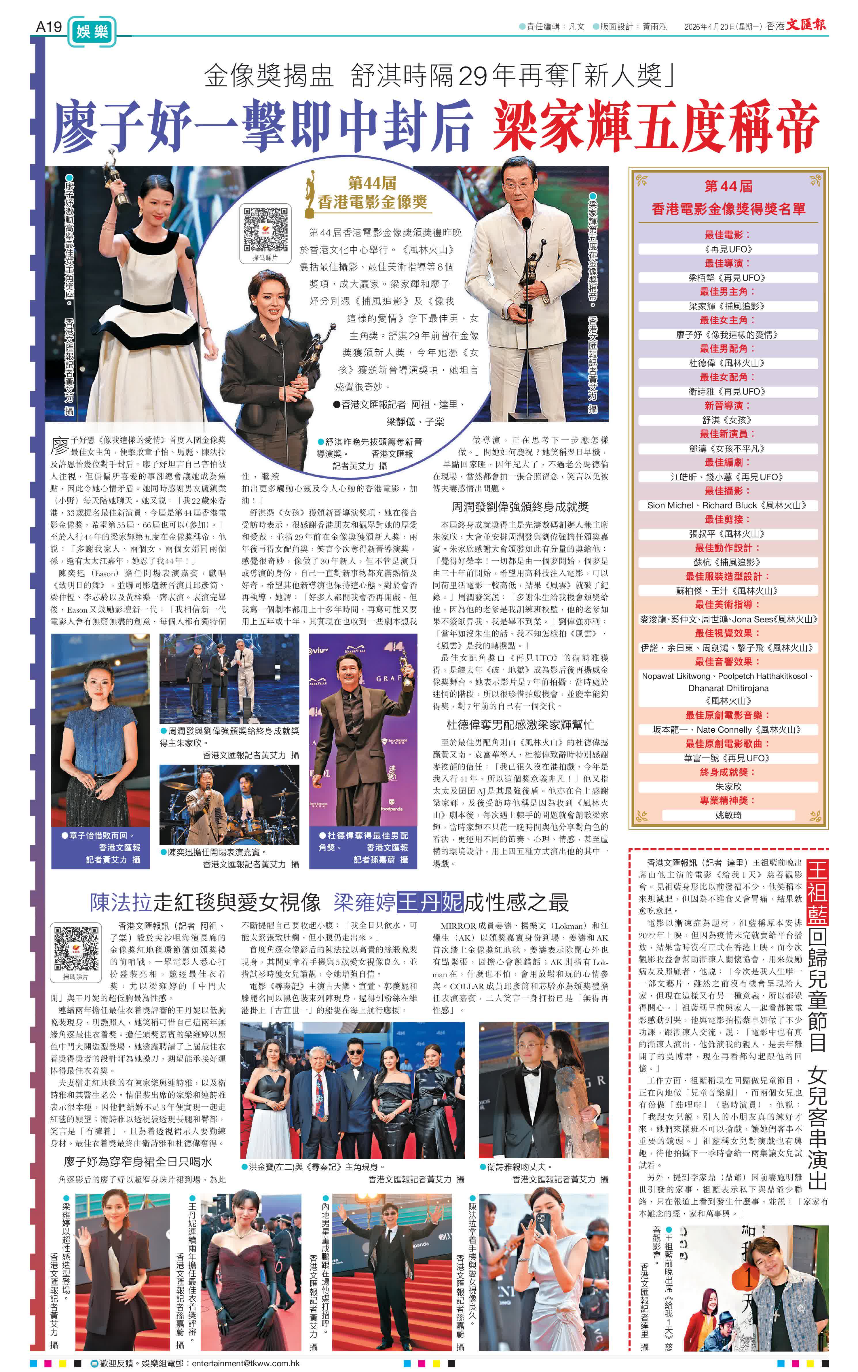 (香港文匯報記者 阿祖、達里、梁靜儀、子棠)第44屆香港電影金像獎頒獎禮昨晚於香港文化中心舉行。《風林火山》囊括最佳攝影、最佳美術指導等8個獎項,成大贏家。梁家輝和廖子妤分別憑《捕風追影》及《像我這樣的愛情》拿下最佳男、女主角獎。舒淇29年前曾在金像獎獲頒新人獎,今年她憑《女孩》獲頒新晉導演獎項,她坦言感覺很奇妙。