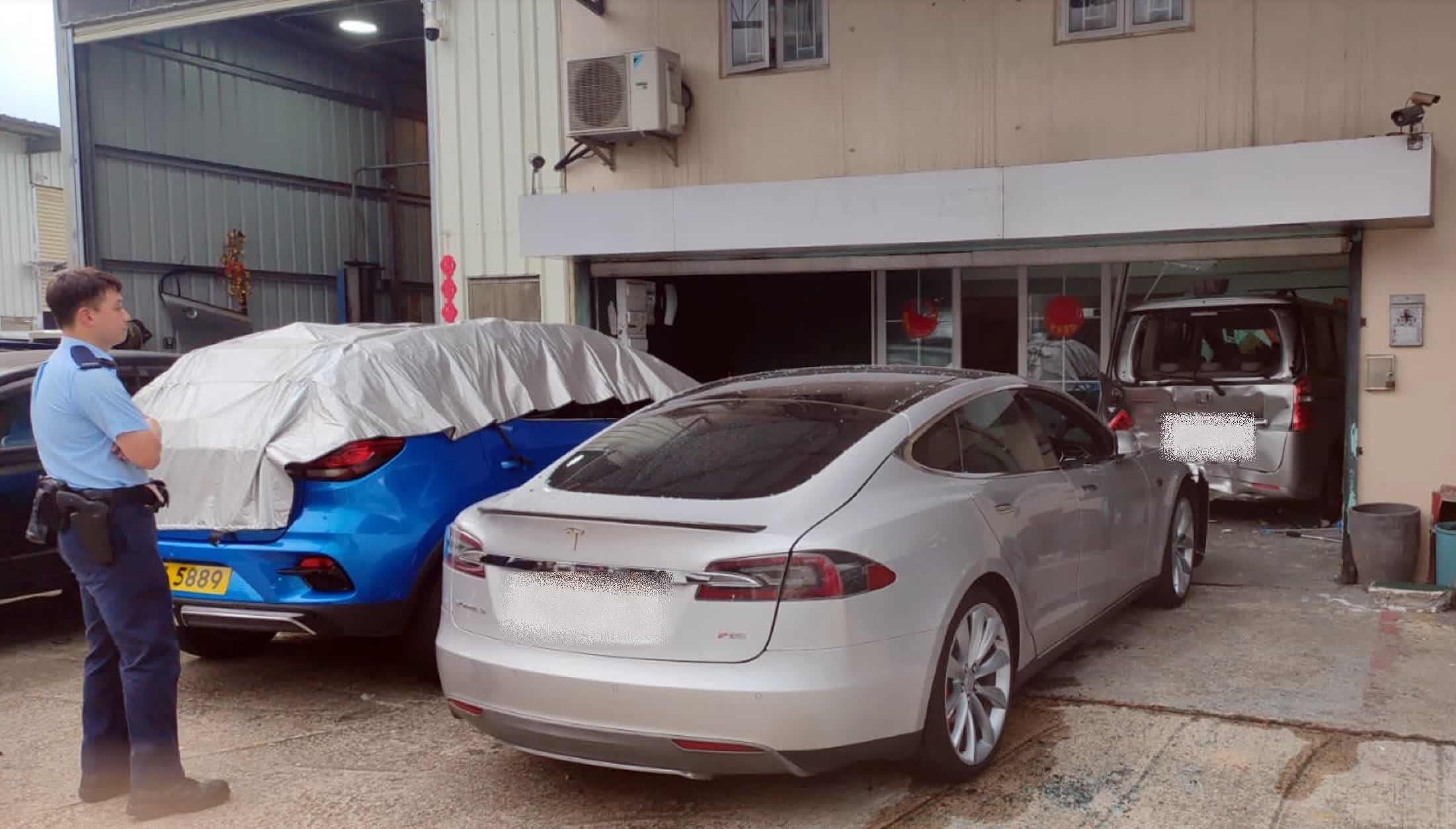 香港文匯報訊(記者 蕭景源)一名16歲少年今日(20日)早上約10時半,在西貢鹿尾村路一車房首日開工期間,疑「揸大膽車」開動一輛Tesla電動車移位時,踩錯油門令車輛失控飆前,直撞向一輛停泊在前方地產舖外的七人車車尾,並將其推前剷入地產舖內,舖內一名67歲姓陳女職員慘遭夾傷腳部被困。消防員接報到場迅將傷者救出送往將軍澳醫院治理。