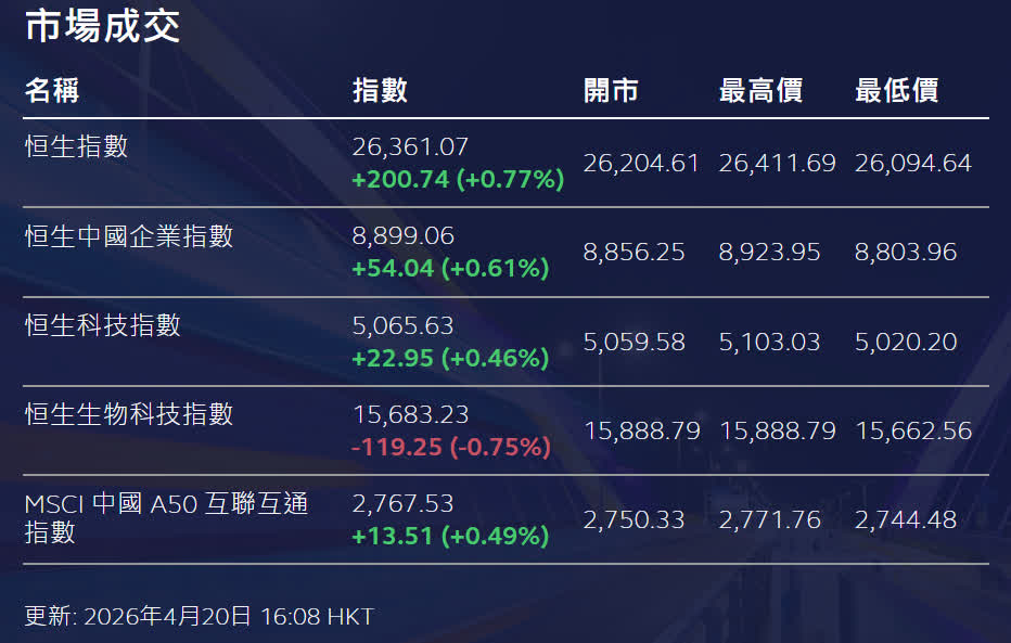 香港文匯報訊 雖然周末中東局勢發展反覆,但投資者對於前景看法偏樂觀,亞洲主要股市今日全線上揚,港股三大指數亦齊升。恒生指數收報26,361點,全日升200點或0.77%。國企指數升0.61%。恒生科技指數升0.46%。成交額約2,414.63億元。