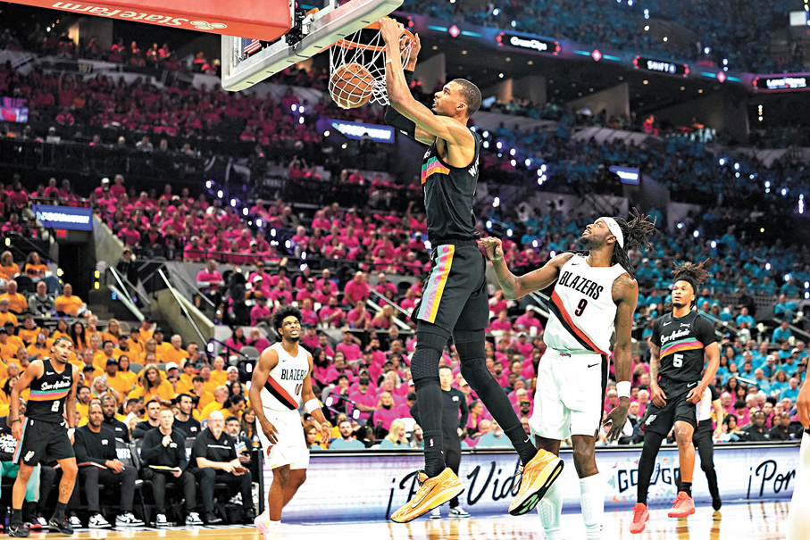 香港文匯報訊(記者 楊浩然)NBA昨日(20日)上演四場季後賽首輪第一戰,其中馬刺主場以111:98擊敗拓荒者旗開得勝,迎來季後賽首秀的主力雲班亞馬則攻入35分,成為馬刺隊史季後賽首秀得分最高球員。