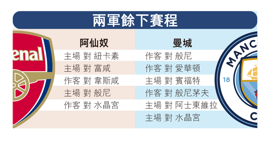 在曼城完成對般尼比賽後,雙方便會同樣只餘下五輪賽事。有著名數據網站分析,阿仙奴餘下賽程其實較容易應付,當中有三場主場比賽(紐卡素、富咸、般尼),另會作客韋斯咸和水晶宮,從牌面計,五場比賽中只有對紐卡素以及兩場客場賽事較有難度。至於曼城餘下同樣有三場主場比賽(賓福特、阿士東維拉、水晶宮),另要作客愛華頓和般尼茅夫,從排名計每一場比賽皆頗有難度,但以曼城目前氣勢,要全數取得勝利亦非毫無可能,因此英國傳媒亦普遍預計,阿仙奴和曼城可能要鬥到最後一周,甚至要依靠得失球差或入球數字,才能分出勝負。