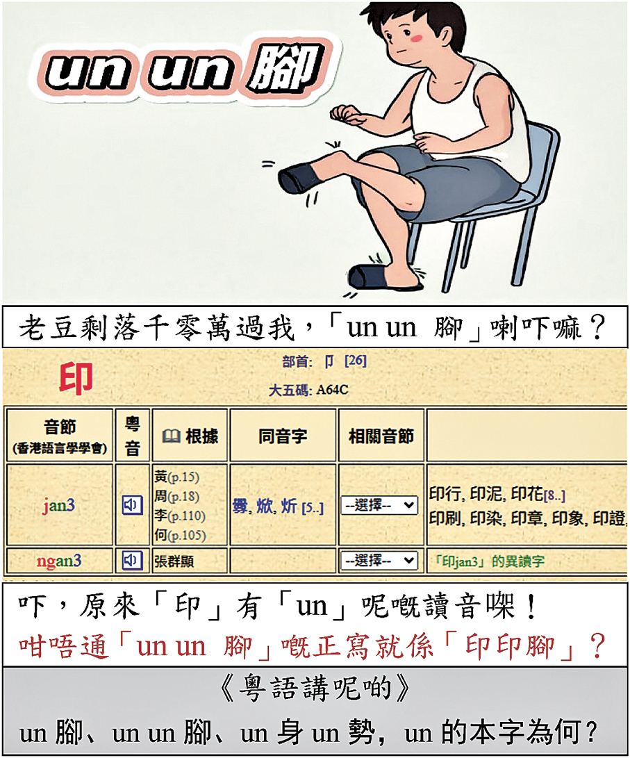 廣東人叫抖動足部做「un腳/un un腳」,不停地抖動身體做「un身un勢」。當中「un」的粵音是「an3/ngan3」。一般香港人不知道「un」字的寫法,都以英文「un」代之,盡顯香港中英夾雜文化的特色。廣東話說的「un腳」正是書面語中的「抖腿」,有顫動腿的意思。