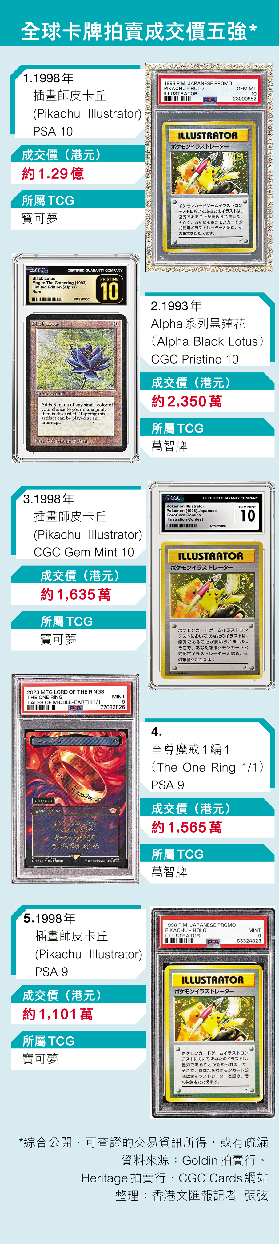 比手掌還要小、印有各種動漫角色的寶可夢集換式卡牌遊戲卡 (Pokémon Trading Card Game(TCG) ) ,今年2月在美國一個拍賣會上,以約1.29億港元的天價成交,震驚全球。隨後,香港接連有出售TCG的店舖亦被歹徒「光顧」,最高痛失兩張市值25萬元的卡牌。香港文匯報記者走訪多個拍賣收藏「聖地」,直擊寶可夢卡近來動輒被炒貴五六倍,背後原因除了是一眾卡通迷的童年回憶,更重要是收藏價值,包括卡牌圖案的熱度、話題度,以及稀有度,部分人鍾情某款動漫或角色而收購卡牌,但市場上也湧現偽卡,有店家和資深玩家呼籲新手要先了解相關資訊,包括卡牌級別、主流鑒定平台、如何鑒別真偽等信息。 ●文︰香港文匯報記者 張弦