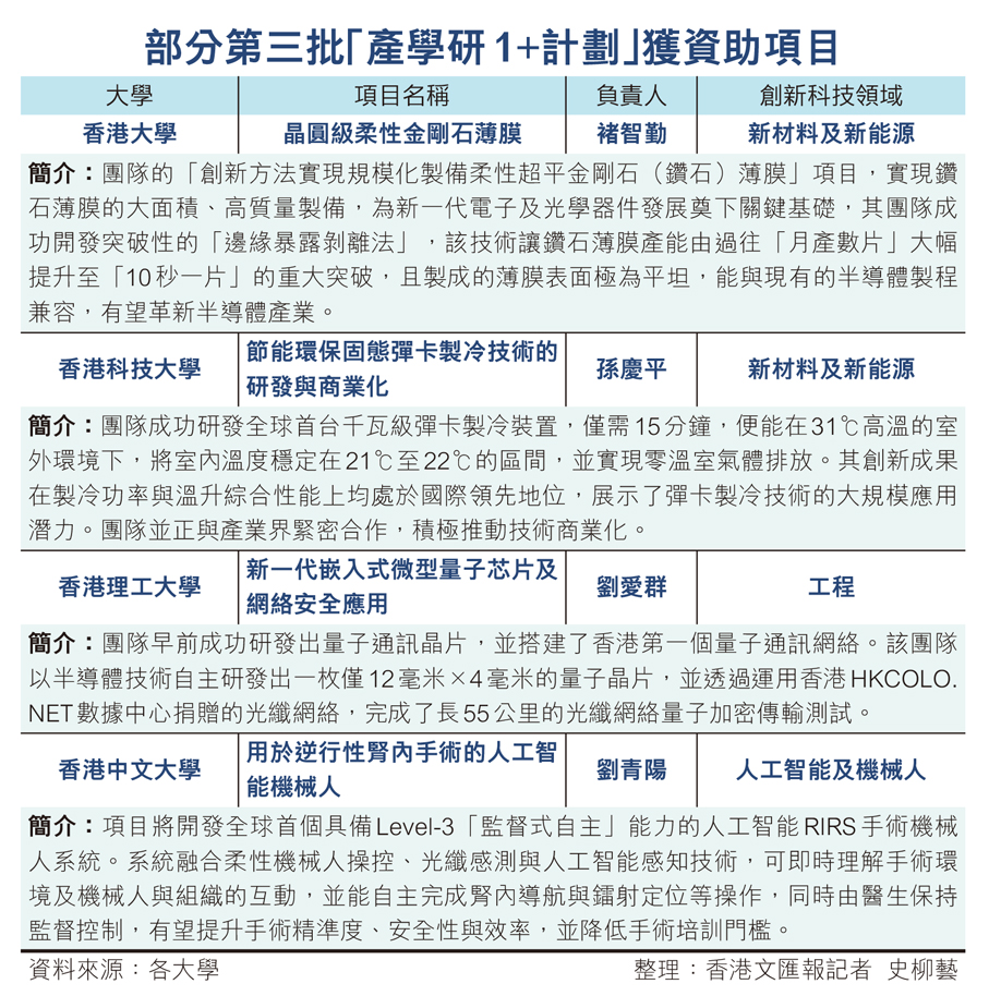 香港文匯報訊(記者 史柳藝)香港正積極推動創科成果產業轉化,特區政府創新科技署「產學研1+計劃」昨日公布第三批名單,共有來自5所大學的24個科研項目獲資助,涉及政府承擔額逾10億元。獲批項目覆蓋多個前沿創科領域,展現了本港政、產、學、研深度融合的強大動能。按大學計,以香港大學及香港科技大學最多項目入選,各有7項研究獲資助支持轉化;而健康及醫藥科學則有6項研究入選,是獲批項目最多的領域,分別涵蓋核酸納米藥物、多肽藥物創新、肝癌精準診療、胰島類器官治療糖尿病等方向。其他大學方面,香港理工大學獲批4個項目;香港中文大學及香港城市大學各獲批3個項目。
