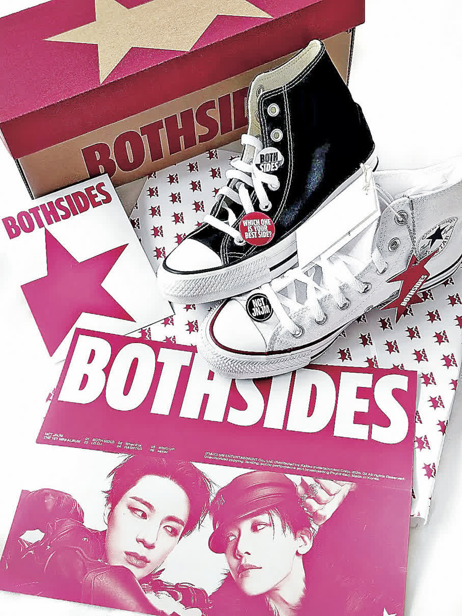 人氣男團NCT成員JENO與渽民組成全新小分隊NCT JNJM出道,首張迷你專輯《BOTH SIDES》以「兩面性」為主題,展現出兩人不同的魅力和個性。出道專輯更將概念延伸到穿搭層面,與街頭休閒品牌Converse合作,推出「BEST SIDE」版本帆布鞋專輯。鞋款以經典黑白雙色的「 Chuck Taylor All Star」 帆布鞋為設計,呼應專輯《BOTH SIDES》主題,粉絲可以揀鞋碼入手,附送的貼紙、徽章等可以為帆布鞋裝飾。不少粉絲在入手帆布鞋專輯後,還用畫筆在鞋上畫出自己喜歡的圖案,DIY屬於自己的偶像周邊,創意滿分。