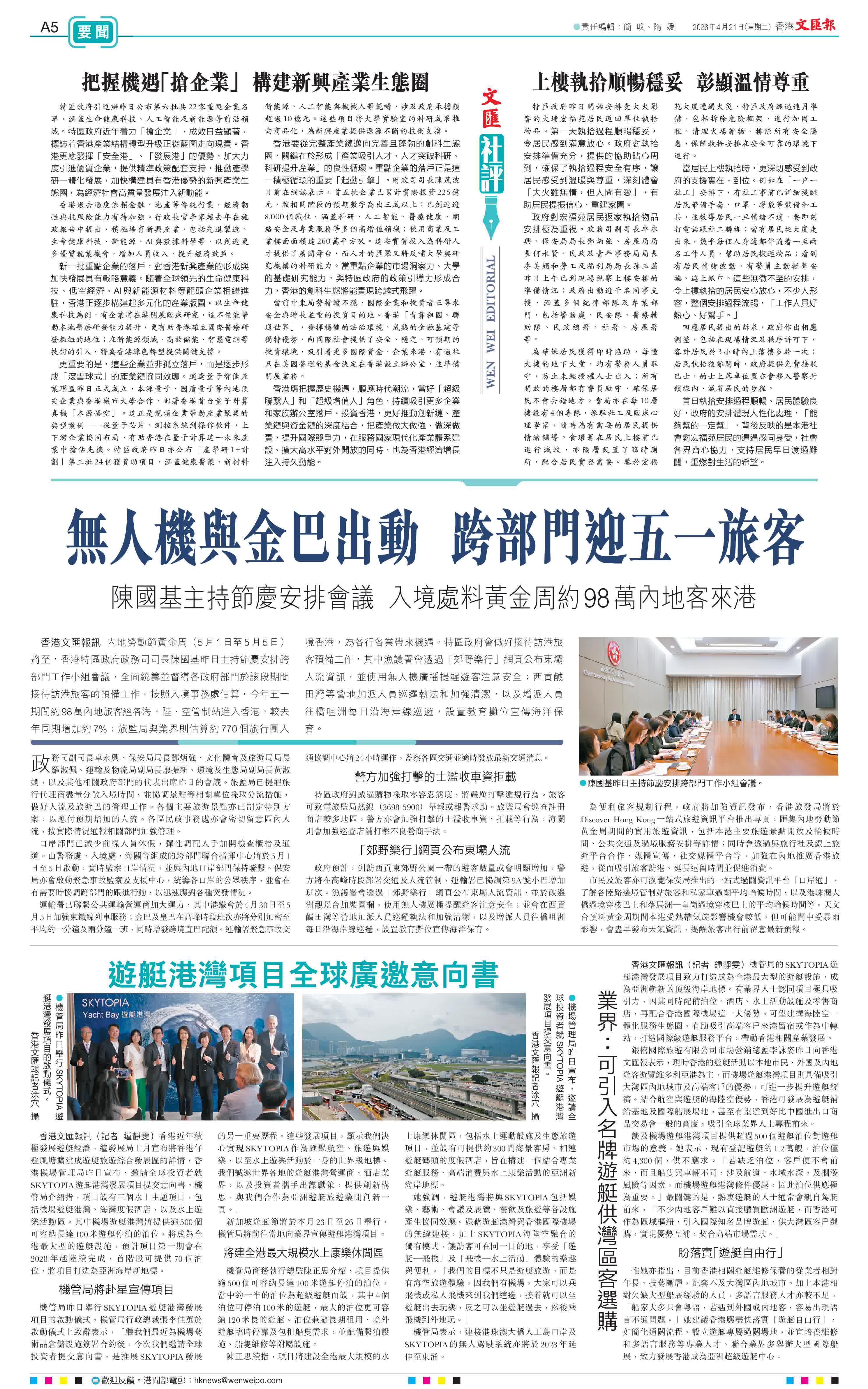 香港文匯報訊 內地勞動節黃金周(5月1日至5月5日)將至,香港特區政府政務司司長陳國基昨日主持節慶安排跨部門工作小組會議,全面統籌並督導各政府部門於該段期間接待訪港旅客的預備工作。按照入境事務處估算,今年五一期間約98萬內地旅客經各海、陸、空管制站進入香港,較去年同期增加約7%;旅監局與業界則估算約770個旅行團入境香港,為各行各業帶來機遇。特區政府會做好接待訪港旅客預備工作,其中漁護署會透過「郊野樂行」網頁公布東壩人流資訊,並使用無人機廣播提醒遊客注意安全;西貢鹹田灣等營地加派人員巡邏執法和加強清潔,以及增派人員往橋咀洲每日沿海岸線巡邏,設置教育攤位宣傳海洋保育。