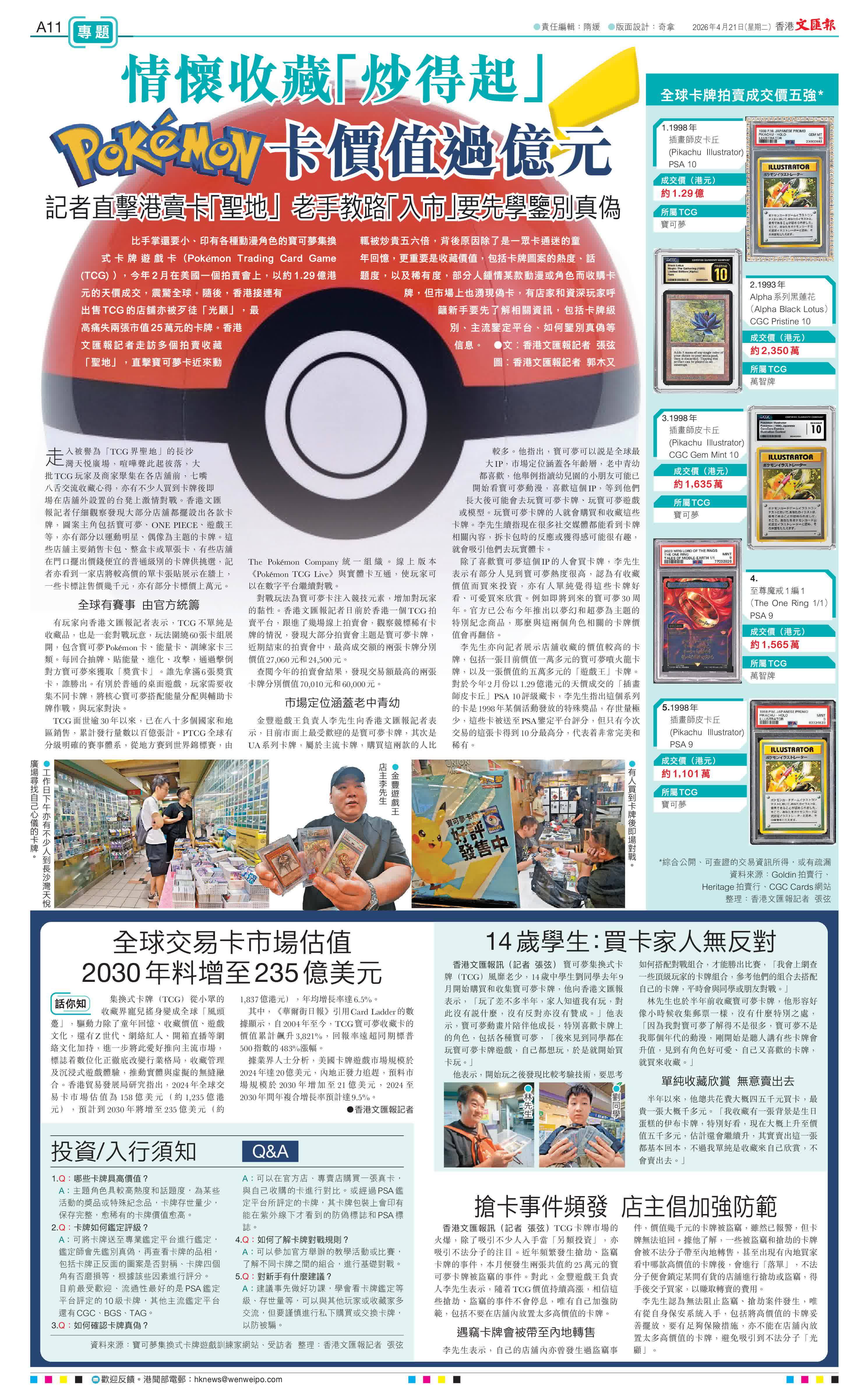 (香港文匯報記者 張弦)比手掌還要小、印有各種動漫角色的寶可夢集換式卡牌遊戲卡 (Pokémon Trading Card Game(TCG) ) ,今年2月在美國一個拍賣會上,以約1.29億港元的天價成交,震驚全球。隨後,香港接連有出售TCG的店舖亦被歹徒「光顧」,最高痛失兩張市值25萬元的卡牌。香港文匯報記者走訪多個拍賣收藏「聖地」,直擊寶可夢卡近來動輒被炒貴五六倍,背後原因除了是一眾卡通迷的童年回憶,更重要是收藏價值,包括卡牌圖案的熱度、話題度,以及稀有度,部分人鍾情某款動漫或角色而收購卡牌,但市場上也湧現偽卡,有店家和資深玩家呼籲新手要先了解相關資訊,包括卡牌級別、主流鑒定平台、如何鑒別真偽等信息。