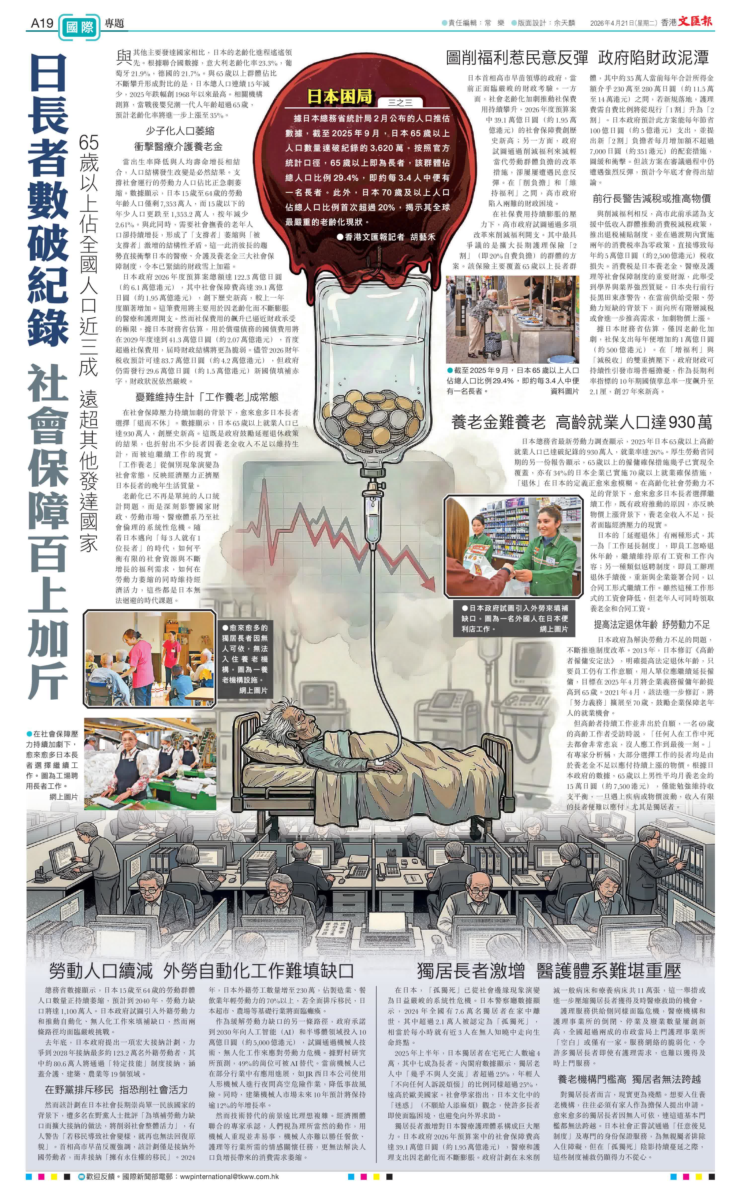 在社會保障壓力持續加劇的背景下,愈來愈多日本長者選擇「退而不休」。數據顯示,日本65歲以上就業人口已達930萬人,創歷史新高。這既是政府鼓勵延遲退休政策的結果,也折射出不少長者因養老金收入不足以維持生計,而被迫繼續工作的現實。「工作養老」從個別現象演變為社會常態,反映經濟壓力正擠壓日本長者的晚年生活質量。