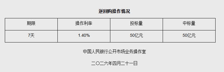 據央行網站消息,2026年4月21日中國人民銀行以固定利率、數量招標方式開展了50億元7天期逆回購操作,全額滿足了一級交易商需求。具體情況如下: