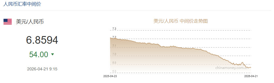 據中國外匯交易中心網站消息,中國人民銀行授權中國外匯交易中心公布,2026年4月21日銀行間外匯市場人民幣匯率中間價為:1美元對人民幣6.8594元,上調54個基點。