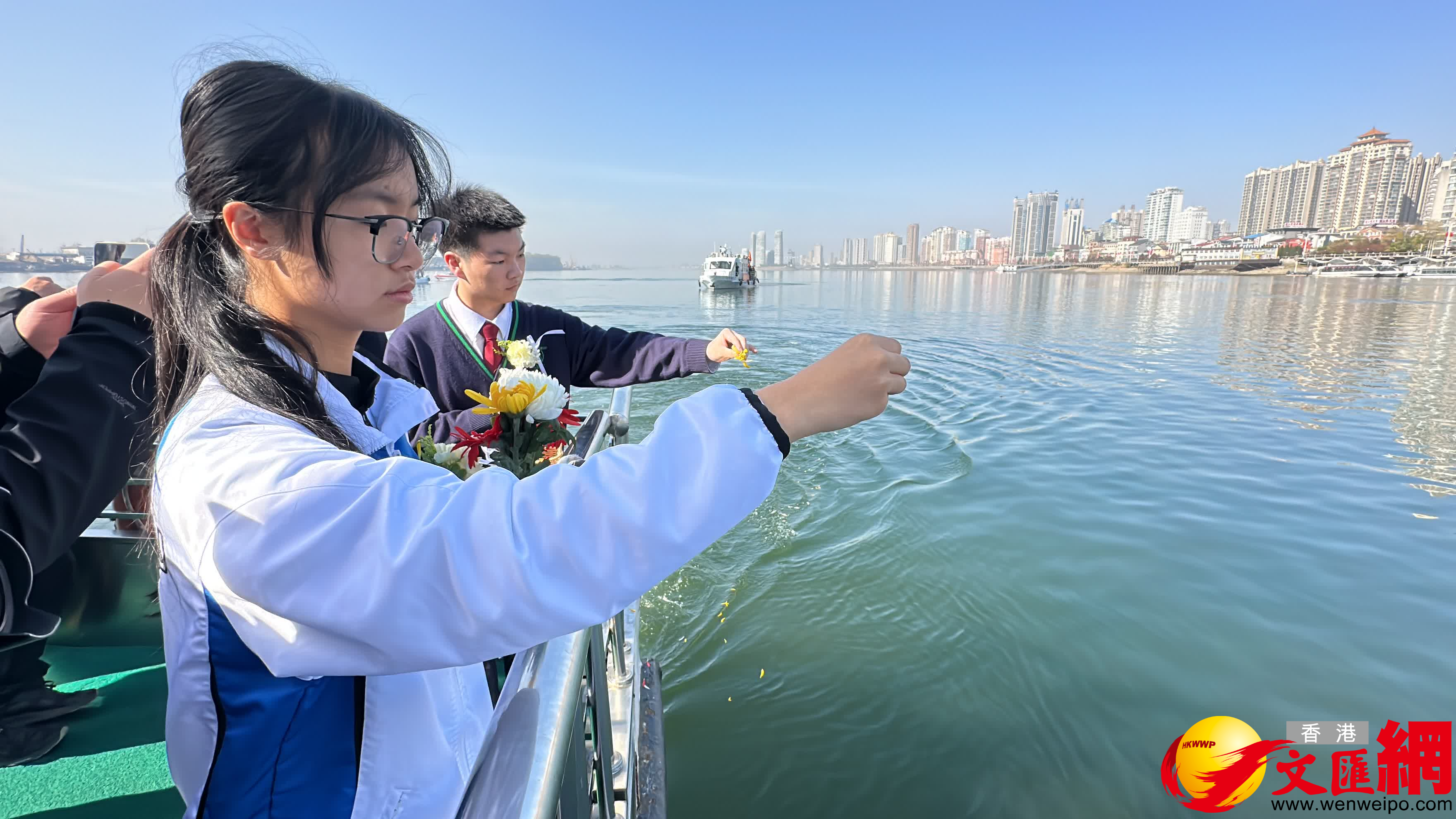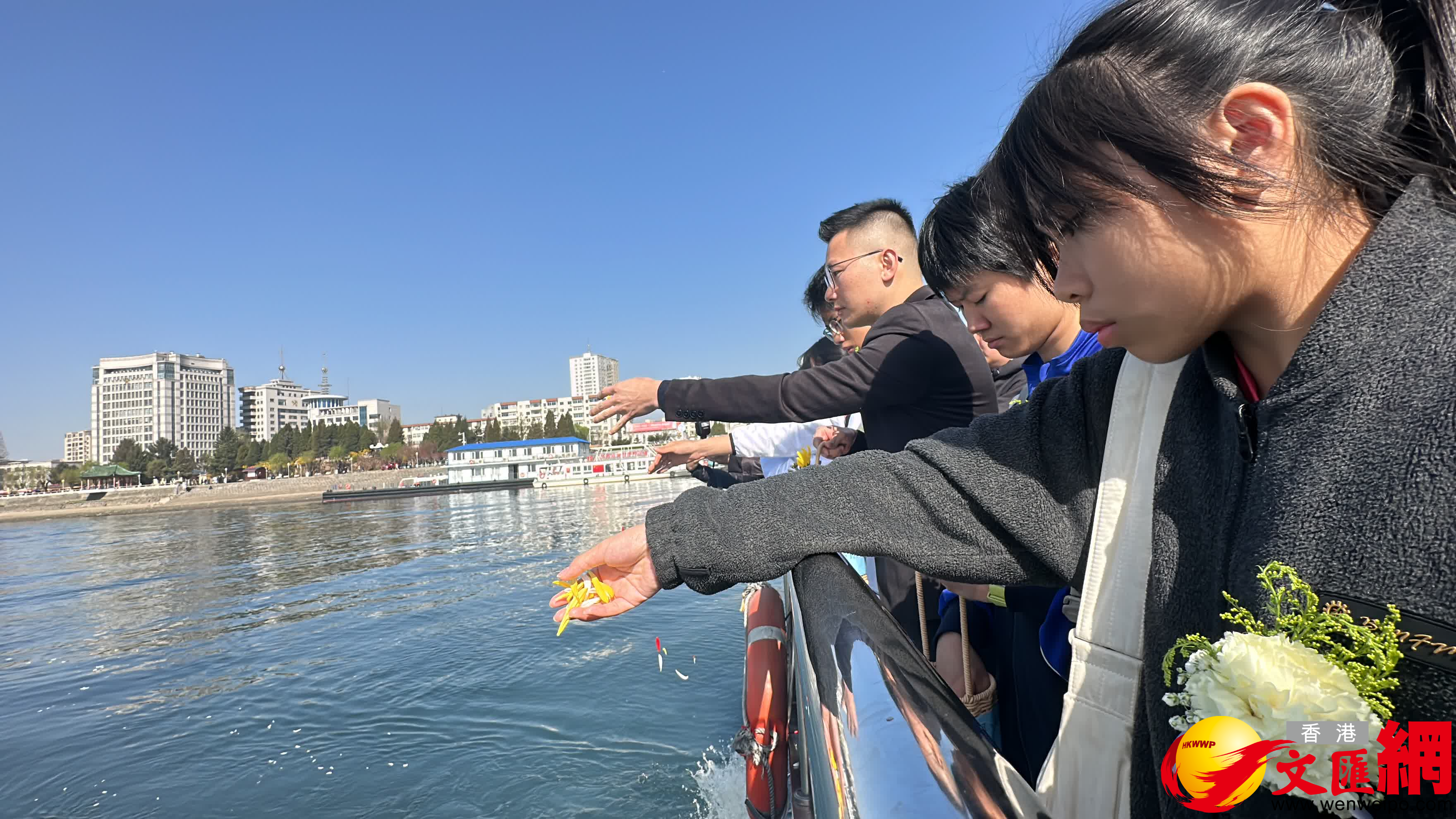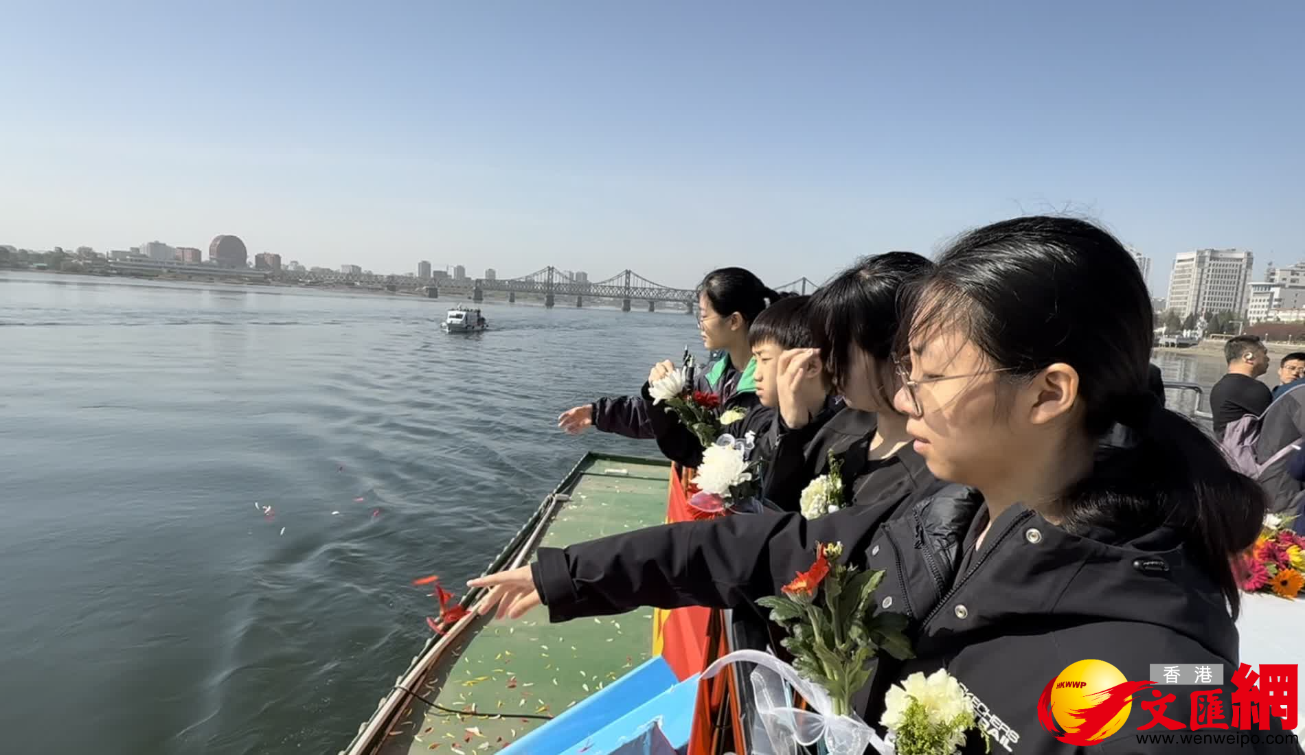 (香港文匯網記者 于珈琳 實習記者 何思熳)21日清晨,鴨綠江畔仍涼意徐徐。來自香港、澳門的師生代表和在瀋陽台胞子女共20餘人,與內地30餘名少先隊員,以及社會各界人士代表,共同乘座名為「歸航」的紀念船來到鴨綠江心,向江上祭撒鮮花。一片片白色、黃色和紅色的菊花瓣伴着船尾涌動的江水匯入奔流的鴨綠江,帶去青年學子們對先烈最崇敬的哀思。香港培僑中學學生在現場向記者表示,這裏也曾是培僑學長跨江作戰的出征地,這次的緬懷和紀念也正是向學長們的告慰。