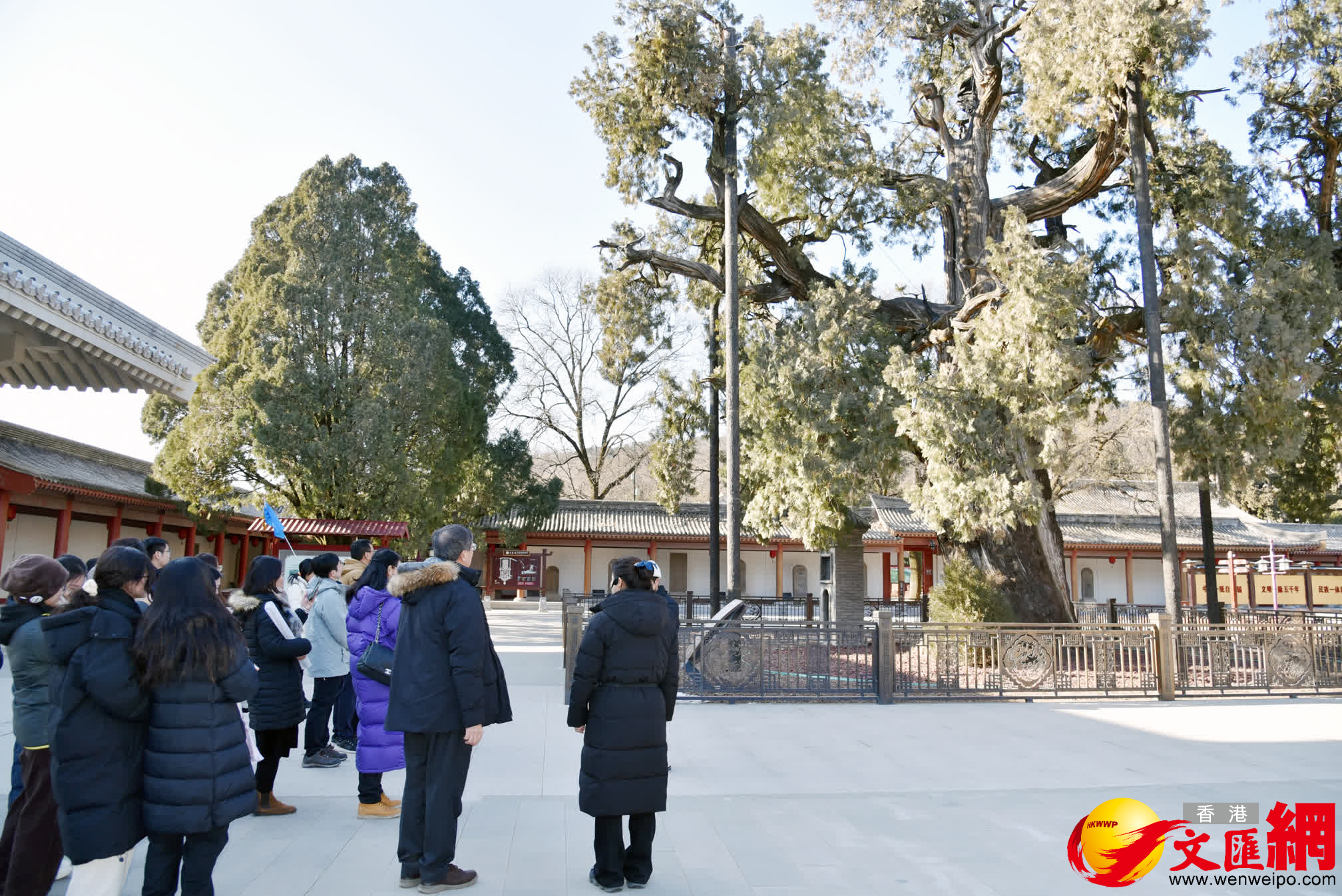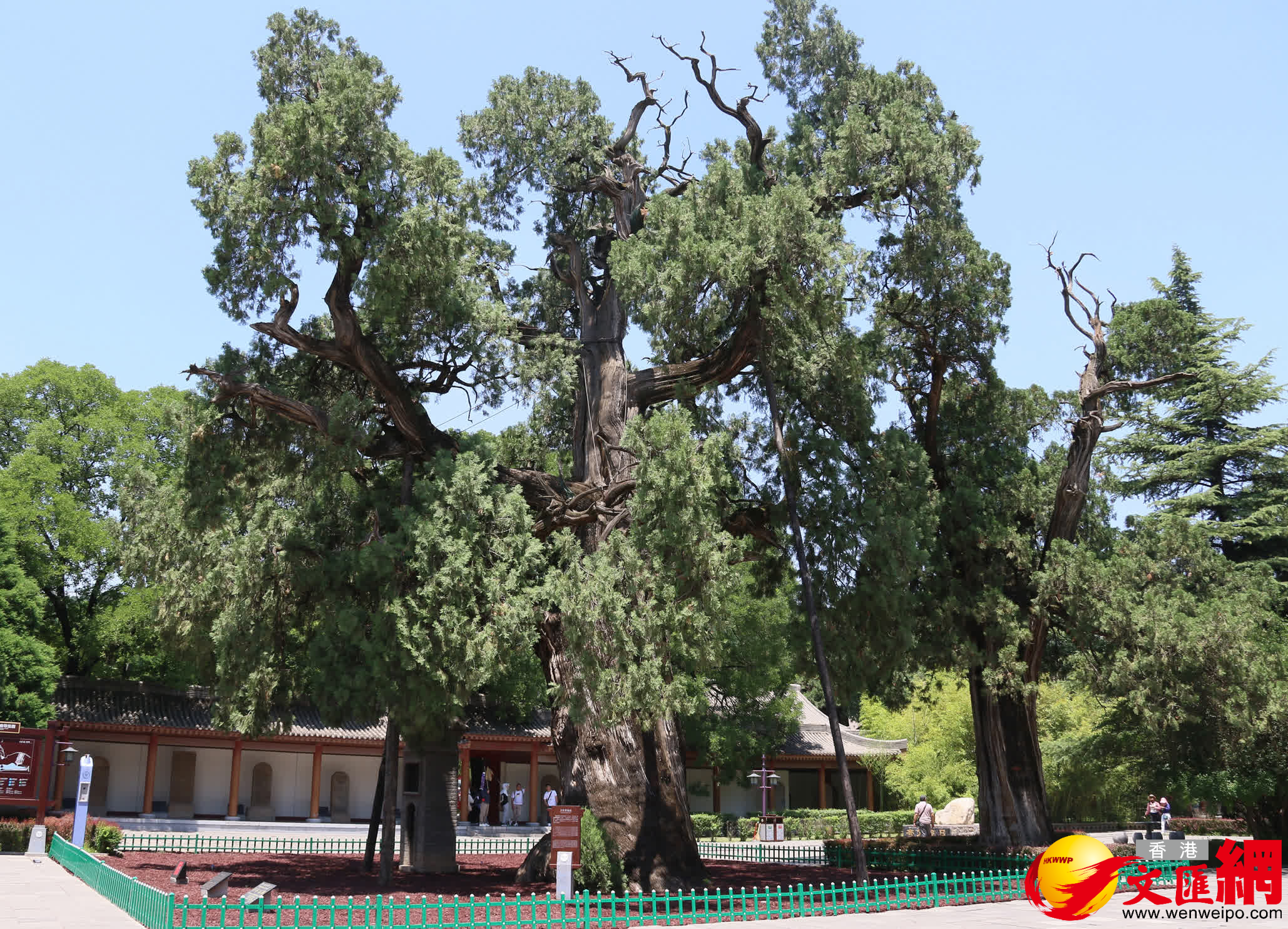 千百年來,謁陵人、護陵人和當地百姓在黃帝陵及周邊大規模種植柏樹。目前,黃帝陵古柏群佔地3000多畝,有古柏8.3萬餘株。其中最古老的一株側柏,相傳為軒轅黃帝所栽,人稱「軒轅柏」,亦稱「黃帝手植柏」。這株古柏高20餘米,胸徑11米,樹冠面積190餘平方米,樹齡超過5000年,是特級保護古樹,被譽為「世界柏樹之父」。另一顆樹齡超過5000年的柏樹名為「保生柏」,樹高15.50米,平均冠幅12.1米。如今這些古柏,由一支超過70人的專職管護隊伍「守護」。