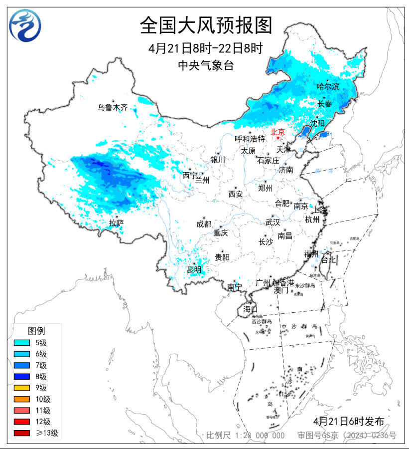 預計,4月21日08時至22日08時,內蒙古中東部、黑龍江中南部、吉林、遼寧以及新疆南疆盆地、西藏北部、青海西部等地部分地區有5~7級風,陣風8~9級,渤海北部海域、黃海北部海域將有7級、陣風8級的風。中央氣象台4月21日06時繼續發布大風藍色預警。