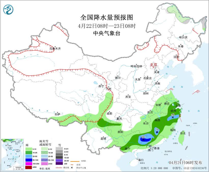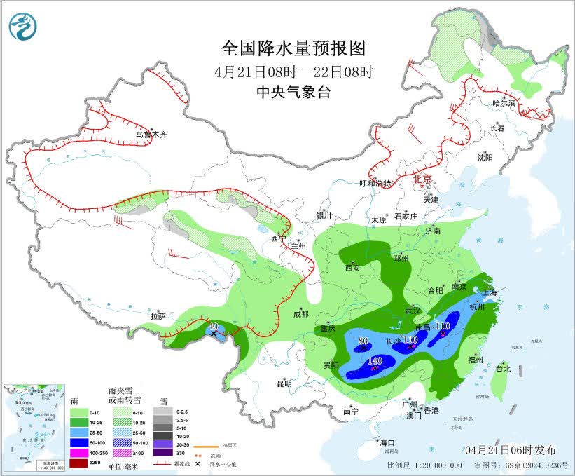 4月21日08時至22日08時,內蒙古東北部、黑龍江西北部、青海北部和西部、甘肅河西等地部分地區有小到中雪或雨夾雪。黃淮西部、江淮西部、江漢東部、江南大部、西南地區東南部、華南北部和東南沿海地區以及西藏東南部等地部分地區有中到大雨,其中,貴州東南部、湖南中南部、江西中北部、廣西東北部等地部分地區有暴雨,局地大暴雨(100~140毫米)。內蒙古中東部、黑龍江中南部、吉林、遼寧以及新疆南疆盆地、西藏北部、青海西部等地部分地區有5~7級風,陣風8~9級,渤海北部海域、黃海北部海域有7級風、陣風8級。