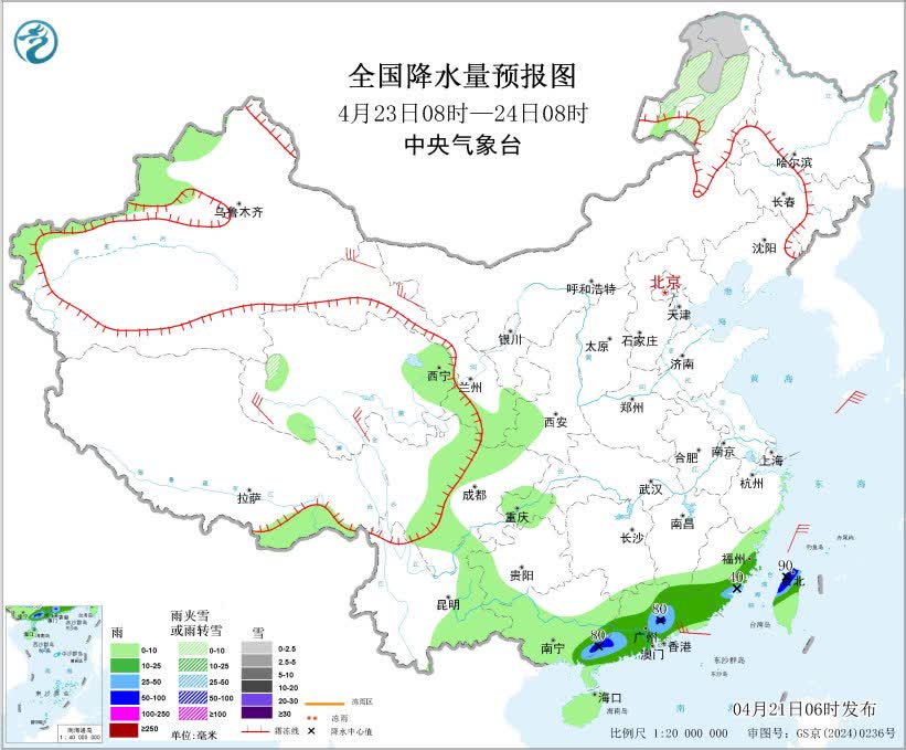 4月23日08時至24日08時,內蒙古東北部、黑龍江西北部等地部分地區有小雪或雨夾雪。廣西東南部、廣東中南部、福建東南部、台灣島等地部分地區有中到大雨,局地有暴雨(50~90毫米)。內蒙古西北部、青海南部和西部、甘肅河西等地部分地區有4~6級風,東海北部有6~7級風、陣風8級。