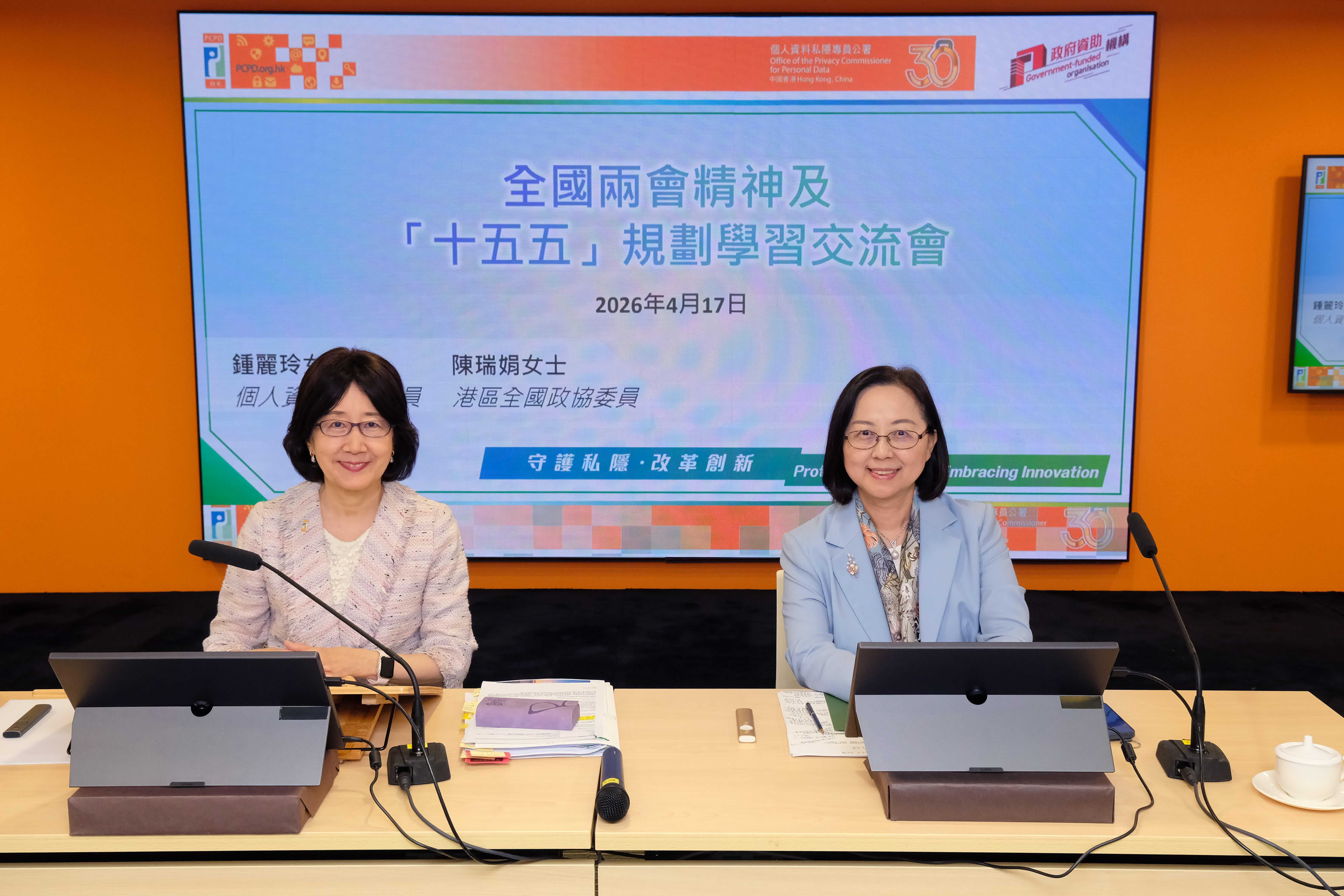 個人資料私隱專員公署早前於2026年4月17日舉辦國家「十五五」規劃綱要學習交流會。公署邀請港區全國政協委員陳瑞娟, BBS擔任交流會嘉賓講者,並由個人資料私隱專員(私隱專員)鍾麗玲, SBS主持交流會,讓公署同事深入了解「十五五」規劃綱要,以及如何在工作中更好主動對接國家「十五五」規劃綱要。