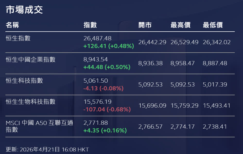 香港文匯報訊 市場氣氛審慎樂觀,港股整體縮量略升,三大指數走勢分化。恒生指數收報26,487點,全日升126點或0.48%。國企指數升0.50%。恒生科技指數跌0.08%。大市成交僅約2,052億元,比周一約2,414.6億元減少約15%,並為4月份以來最低水平。