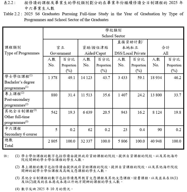 香港文匯報訊(記者 莫楠)教育局最新公布的《2025年中六學生出路統計調查》顯示,本地中六畢業生整體升學取向仍以留港為主,選擇到境外升學的比例續跌。調查在43,561名有回應的2025年中六畢業生中九成四繼續修讀全日制課程;其中逾九成三留港升學,僅6.5%選擇到香港以外地區升學,較去年的7.8%再降1.3個百分點。至於境外升學目的地,以赴內地者最多,佔47.1%;傳統北美熱門留學地美國及加拿大合共僅約5.8%。數據反映在地緣政治及國際局勢不明朗等因素下,部分學生對歐美傳統留學地意欲轉弱,升學選擇更趨向亞洲地區。