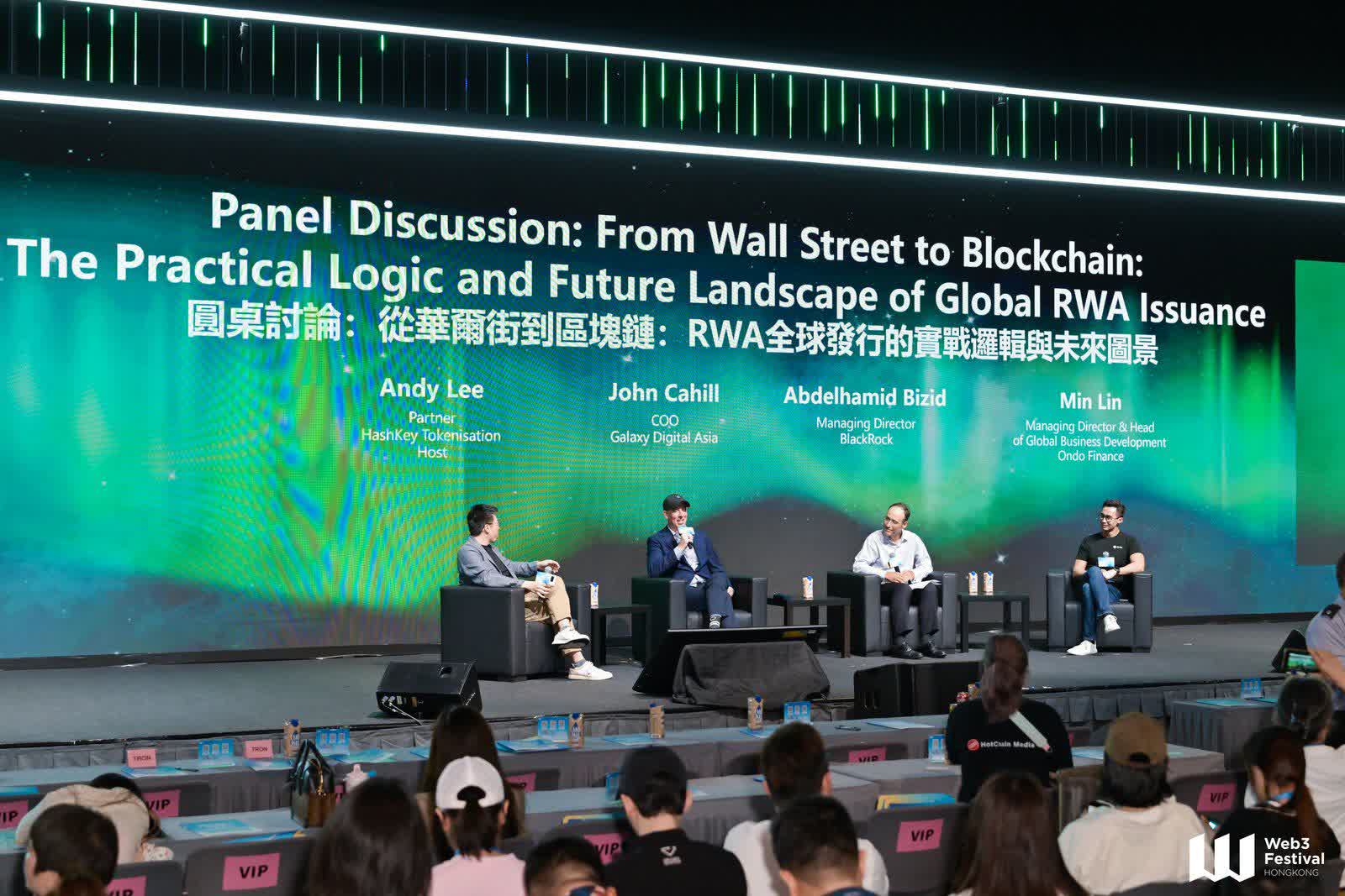 香港文匯報訊 HashKey Tokenisation合夥人Andy Lee、Galaxy Digital亞洲首席運營官John Cahill、貝萊德集團董事總經理Abdelhamid Bizid,以及Ondo Finance董事總經理兼全球業務發展負責人Min Lin,共同出席2026香港Web3嘉年華圓桌會議,圍繞「從華爾街到區塊鏈:RWA全球發行的實戰邏輯與未來圖景」主題展開深入分享。