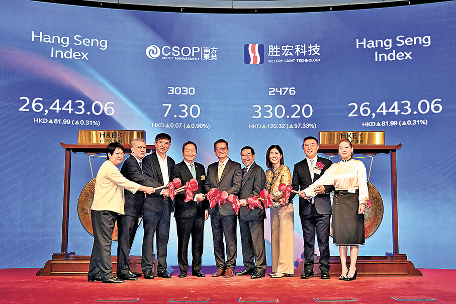 今年新股上市一浪高過一浪,昨日再有兩隻新股上市,並同創今年新股市場之最。南方東英黃金ETF(3030)及勝宏科技(2476)昨首日掛牌,財政司司長陳茂波在上市儀式上表示,港股昨迎來了兩個「最大」:一個是香港最大的本土實物黃金ETF(交易所買賣基金)上市,另一個是今年來香港最大IPO,形容是「好事成雙」。輝達供應商之一、今年港股暫時的「集資王」勝宏科技首日造好,該股收報315元,較招股價高五成,每手賬面賺10,512元。