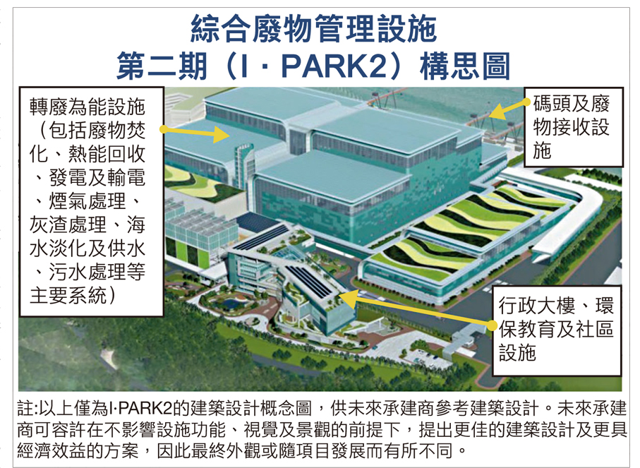 香港文匯報訊 (記者 常樂)香港正朝着「零廢堆填」的目標進發,特區政府環境及生態局昨日向立法會環境事務委員會提交文件,建議興建「綜合廢物管理設施第二期」(I·PARK2),經修正後費用約為292億元,造價比初步估算約357億元為低。工程包括建造一座設計處理量為每日6,000公噸都市固體廢物的轉廢為能設施(I·PARK2),以及行政大樓、環保教育及社區設施等。目標約2031年起分階段完成。