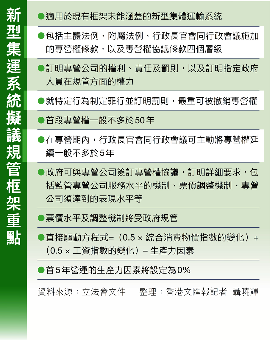 政府近年積極推動交通運輸持續發展,包括引入「智慧綠色集體運輸系統」,並已啟動東九龍、啟德及洪水橋/厦村新發展區3個相關項目。香港特區政府運輸及物流局昨日向立法會提交文件建議引入一套技術中立、通用且標準化的規管框架,日後無須就每個系統另訂主體法例。首段專營權一般不多於50年;票價水平及調整機制將受規管,採用直接驅動方程式票價調整機制,每年按消費物價指數和工資指數變化等數據進行上下調整,無須經任何機關審批。投標者建議的初始票價將成評標考慮因素之一。政府目標今年第四季向立法會提交主體法例的草案。當新法例生效後,料明年起由行政長官會同行政會議就上述3個項目批出營運系統及進行相關設計和建造工作的專營權。 ●香港文匯報記者 黃子龍