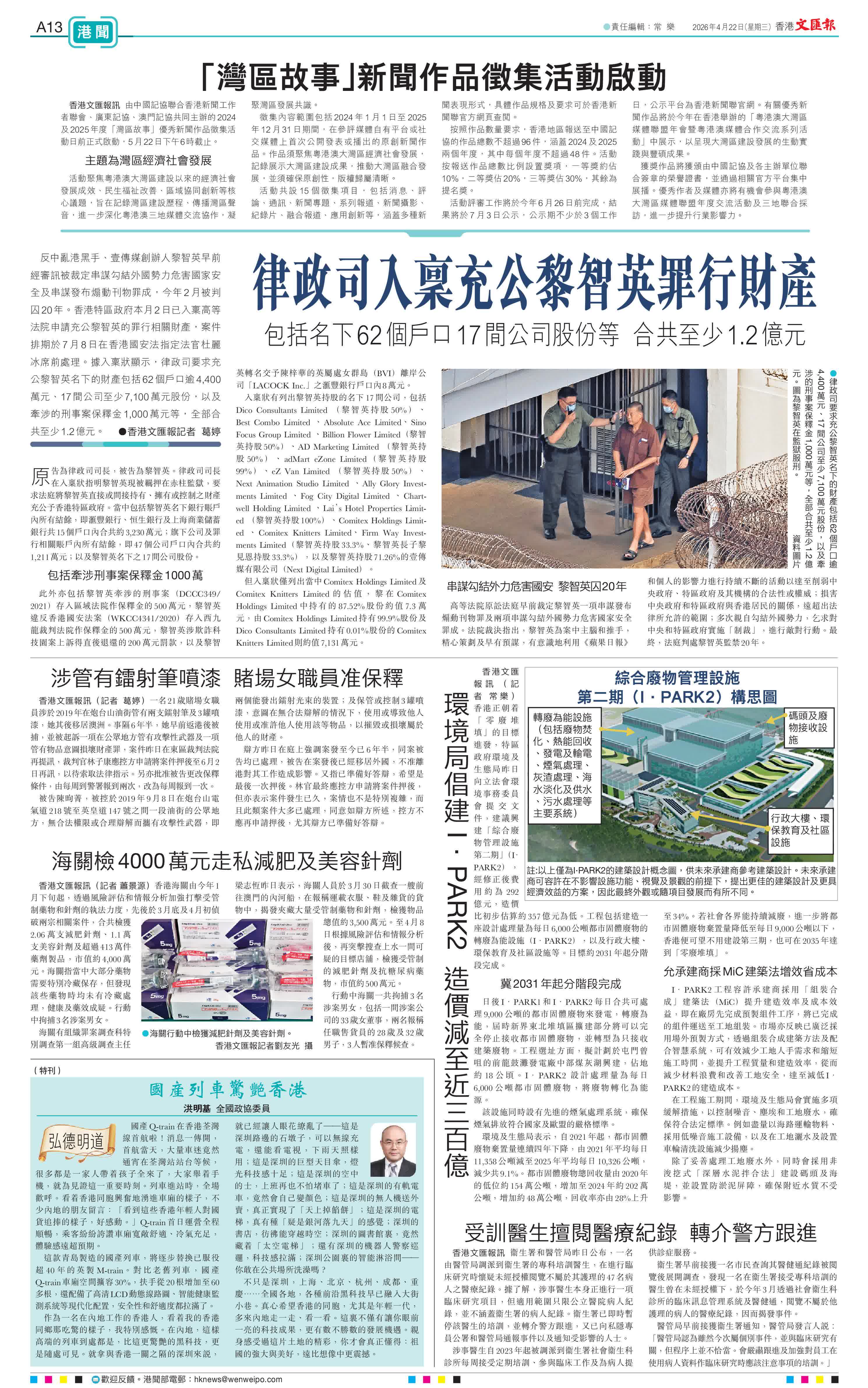 入稟狀有列出黎智英持股的名下17間公司,包括Dico Consultants Limited (黎智英持股50%)、Best Combo Limited 、Absolute Ace Limited、Sino Focus Group Limited 、Billion Flower Limited(黎智英持股50%)、AD Marketing Limited (黎智英持股50%)、adMart eZone Limited(黎智英持股99%)、eZ Van Limited (黎智英持股50%)、Next Animation Studio Limited 、Ally Glory Investments Limited 、Fog City Digital Limited 、Chartwell Holding Limited 、Lai’s Hotel Properties Limited (黎智英持股100%)、Comitex Holdings Limited 、Comitex Knitters Limited、Firm Way Investments Limited(黎智英持股33.3%、黎智英長子黎見恩持股33.3%),以及黎智英持股71.26%的壹傳媒有限公司(Next Digital Limited)。