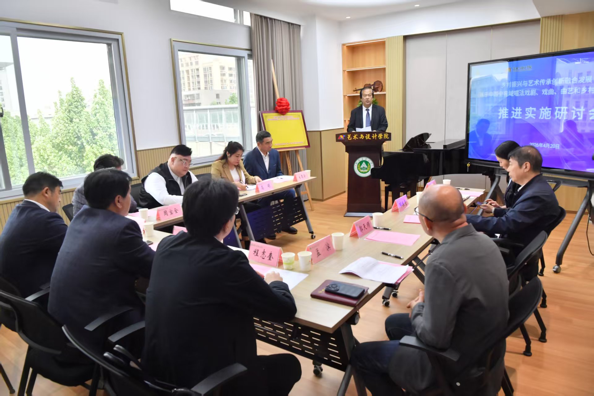 郭天順就項目建設情況作專題匯報,介紹了學院鄉村振興與藝術傳承創新融合發展中心的設立背景、功能定位與發展目標。他表示,中心將推動理論研究、教學實踐、藝術創作與社會服務一體化發展,依託河南深厚的文化底蘊,推動戲曲、曲藝等傳統藝術實現活態傳承與創新發展,既是服務國家鄉村振興戰略,也是學校推進 「雙一流」 建設的具體實踐。
