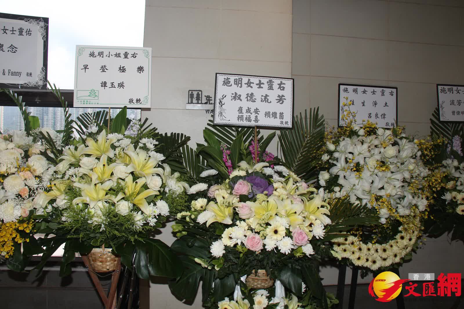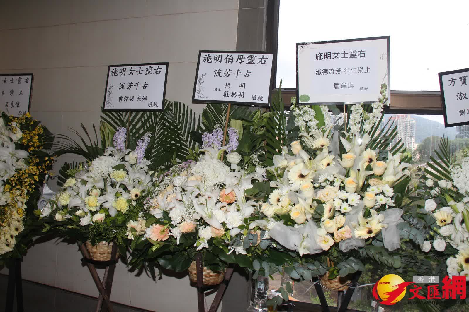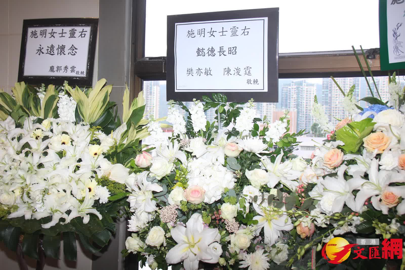 而在三人抵達前,靈堂所見,施明的遺照用白色花圍繞着,橫額寫上「轉生淨土」,鼎爺和兩個兒子及3個孫兒共六個花牌擺放在正中央;但另一個有鼎爺、李泳豪和Agnes名字的花牌卻被置放門外。另外,古天樂、華娃、楊明和莊思明、龐郭秀雲、譚玉瑛、唐韋琪等也有送上花牌。