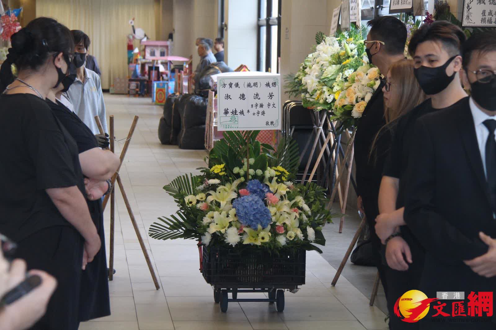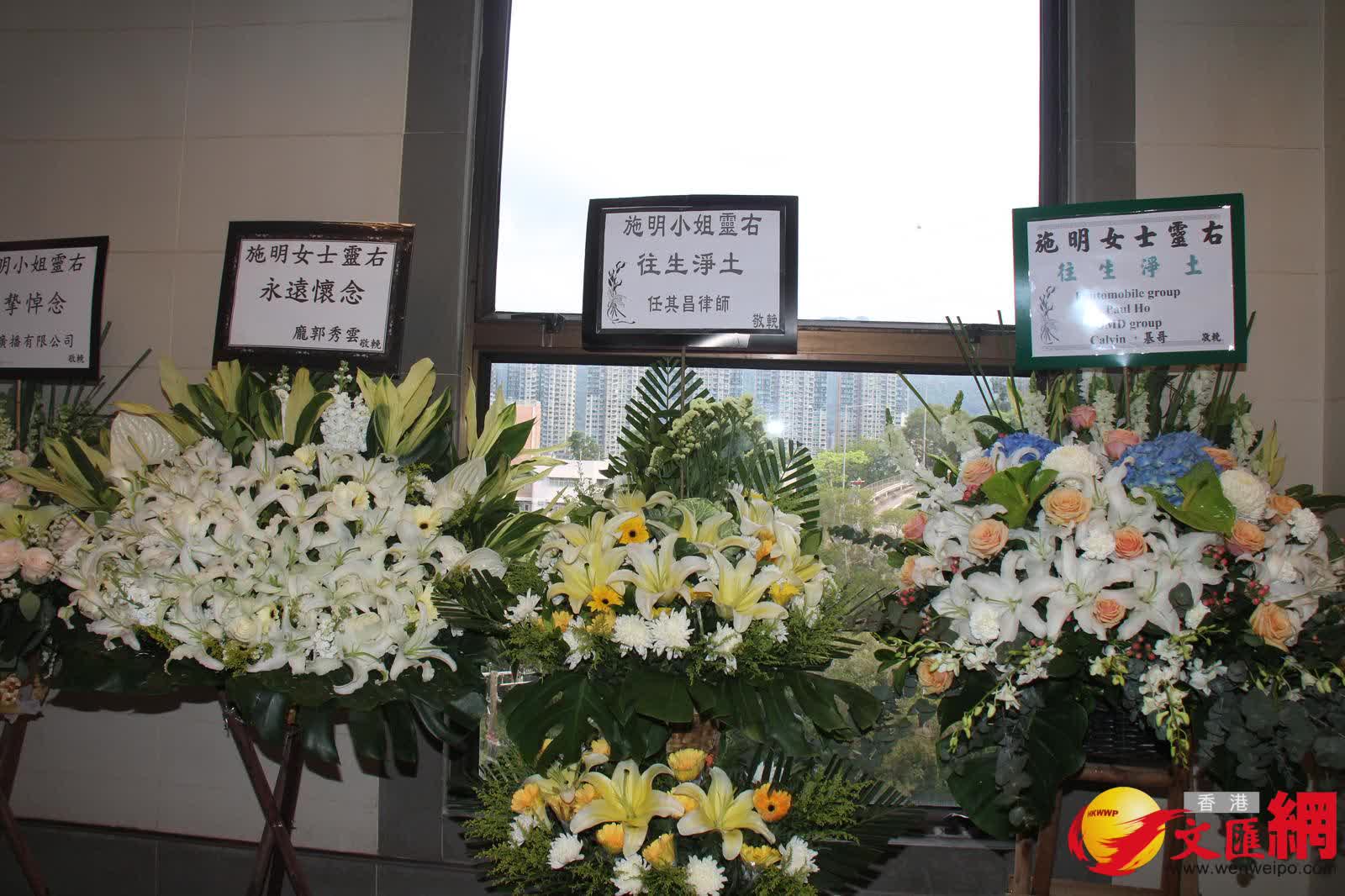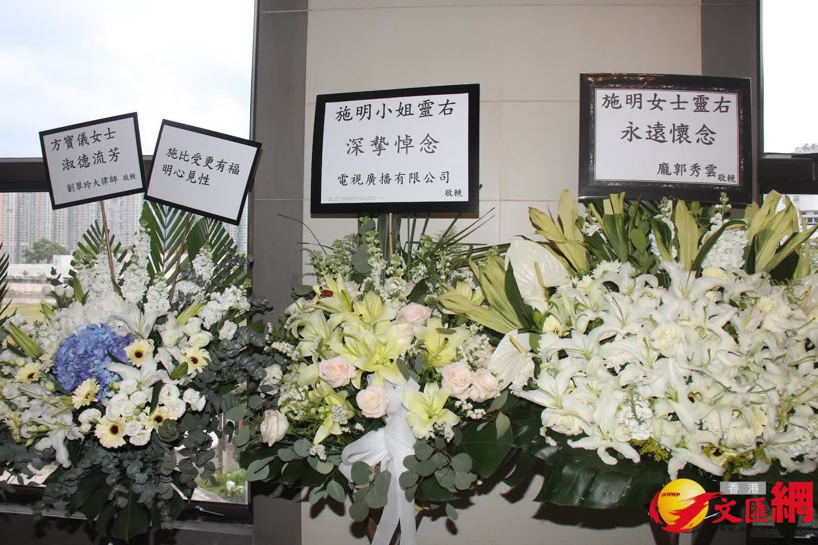 而在三人抵達前,靈堂所見,施明的遺照用白色花圍繞着,橫額寫上「轉生淨土」,鼎爺和兩個兒子及3個孫兒共六個花牌擺放在正中央;但另一個有鼎爺、李泳豪和Agnes名字的花牌卻被置放門外。另外,古天樂、華娃、楊明和莊思明、龐郭秀雲、譚玉瑛、唐韋琪等也有送上花牌。