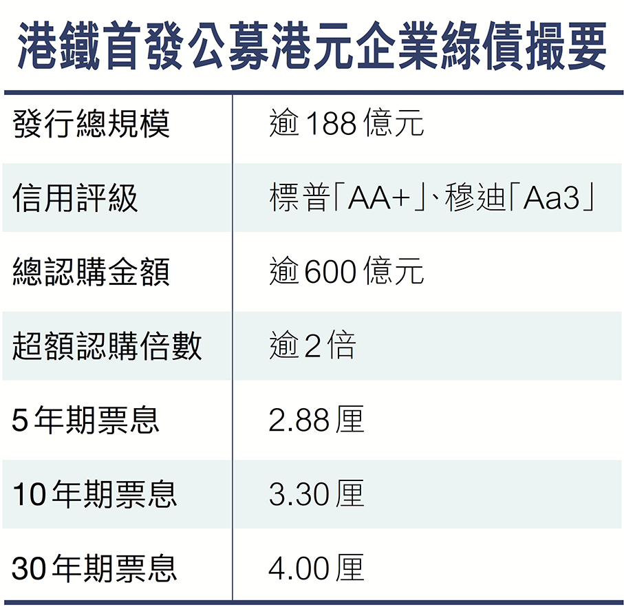 港鐵是次債券分別獲標準普爾及穆迪評為「AA+」及「Aa3」級,反映市場對港鐵信貸質素的高度認可。其中,逾83億港元5年期債券、75億港元10年期債券及30億港元30年期債券,票息分別為2.88厘、3.3厘及4厘。發行所得款項將按港鐵《可持續融資框架》,用作支持合資格的綠色投資項目,包括未來香港大型鐵路基建的擴建與優化。港鐵此前曾發行未上市的港元票據,但並非通過公開方式發售,是次為首次以公募形式登場。