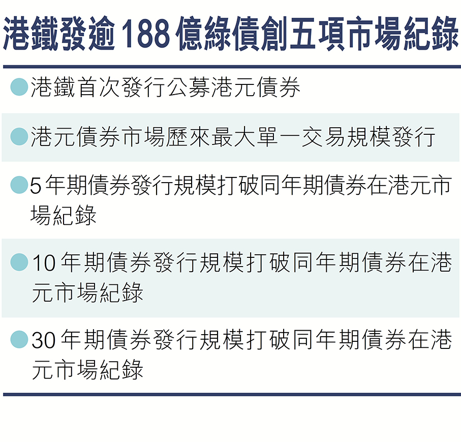 全球地緣政治局勢持續動盪,港元資產的避險屬性日益凸顯,加上港息低於美息,融資成本更具競爭力。 港鐵公司(0066)昨宣布,成功為逾188億港元企業綠色債券定價,市場反應熱烈,合計認購金額高達逾600億元,超購逾2倍。是次發債一舉締造五項市場紀錄:這是港鐵首次發行公募港元債券,亦是港元債券市場歷來最大單一交易規模發行,而債券分設5年期、10年期及30年期,各年期發行規模亦分別打破同年期債券在港元市場的紀錄。綜合市場分析,環球多元機構繼續看好港元作為全球融資貨幣的趨勢,又指港鐵是次能以較低利率大規模融資,不僅體現其優質信貸評級,更有望為北部都會區在內的新鐵路項目提供充足「彈藥」。