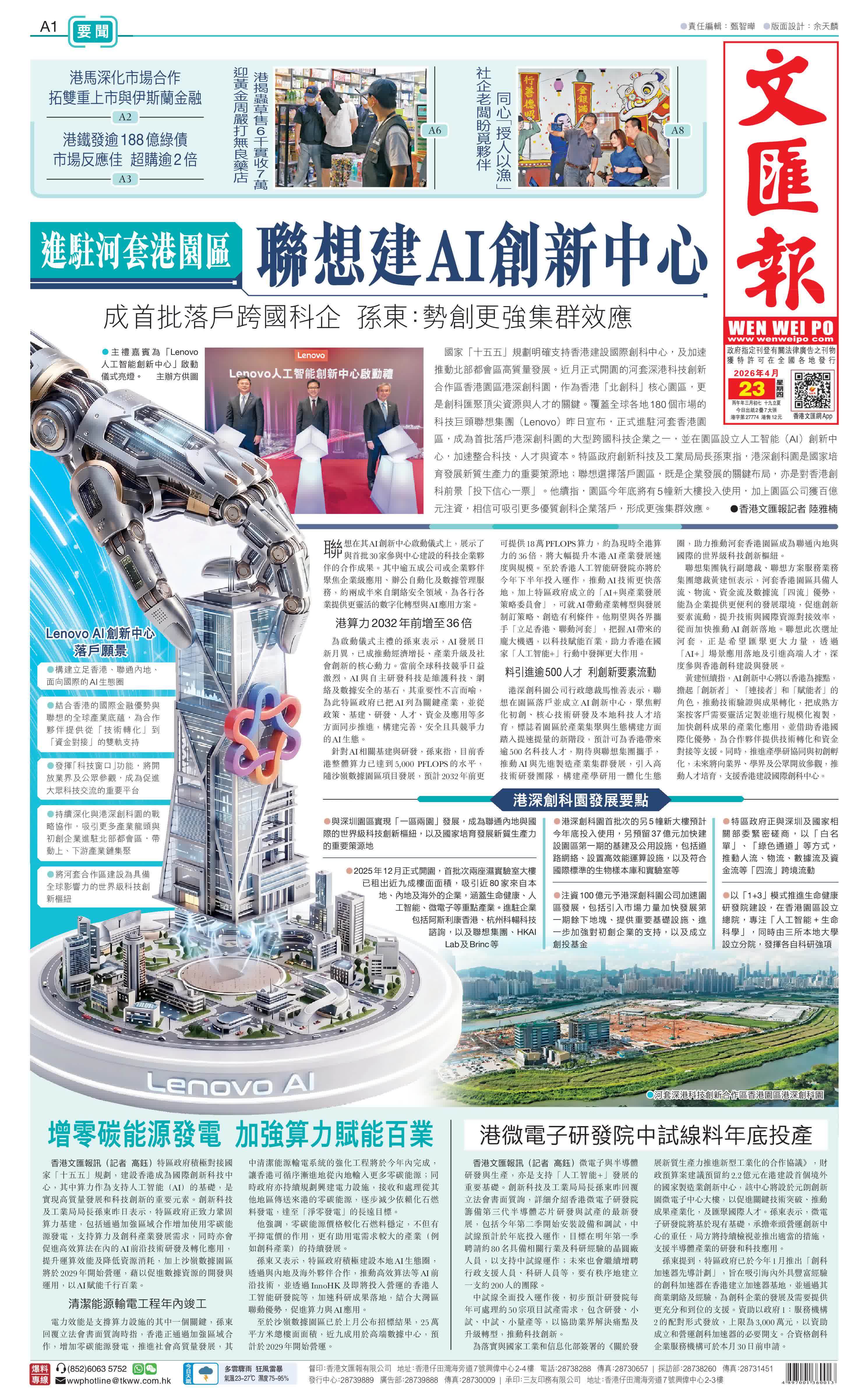 香港文匯報訊(記者 陸雅楠)國家「十五五」規劃明確支持香港建設國際創科中心,及加速推動北部都會區高質量發展。近月正式開園的河套深港科技創新合作區香港園區港深創科園,作為香港「北創科」核心園區,更是創科匯聚頂尖資源與人才的關鍵。覆蓋全球各地180個市場的科技巨頭聯想集團(Lenovo)昨日宣布,正式進駐河套香港園區,成為首批落戶港深創科園的大型跨國科技企業之一,並在園區設立人工智能(AI)創新中心,加速整合科技、人才與資本。特區政府創新科技及工業局局長孫東指,港深創科園是國家培育發展新質生產力的重要策源地;聯想選擇落戶園區,既是企業發展的關鍵布局,亦是對香港創科前景「投下信心一票」。他續指,園區今年底將有5幢新大樓投入使用,加上園區公司獲百億元注資,相信可吸引更多優質創科企業落戶,形成更強集群效應。