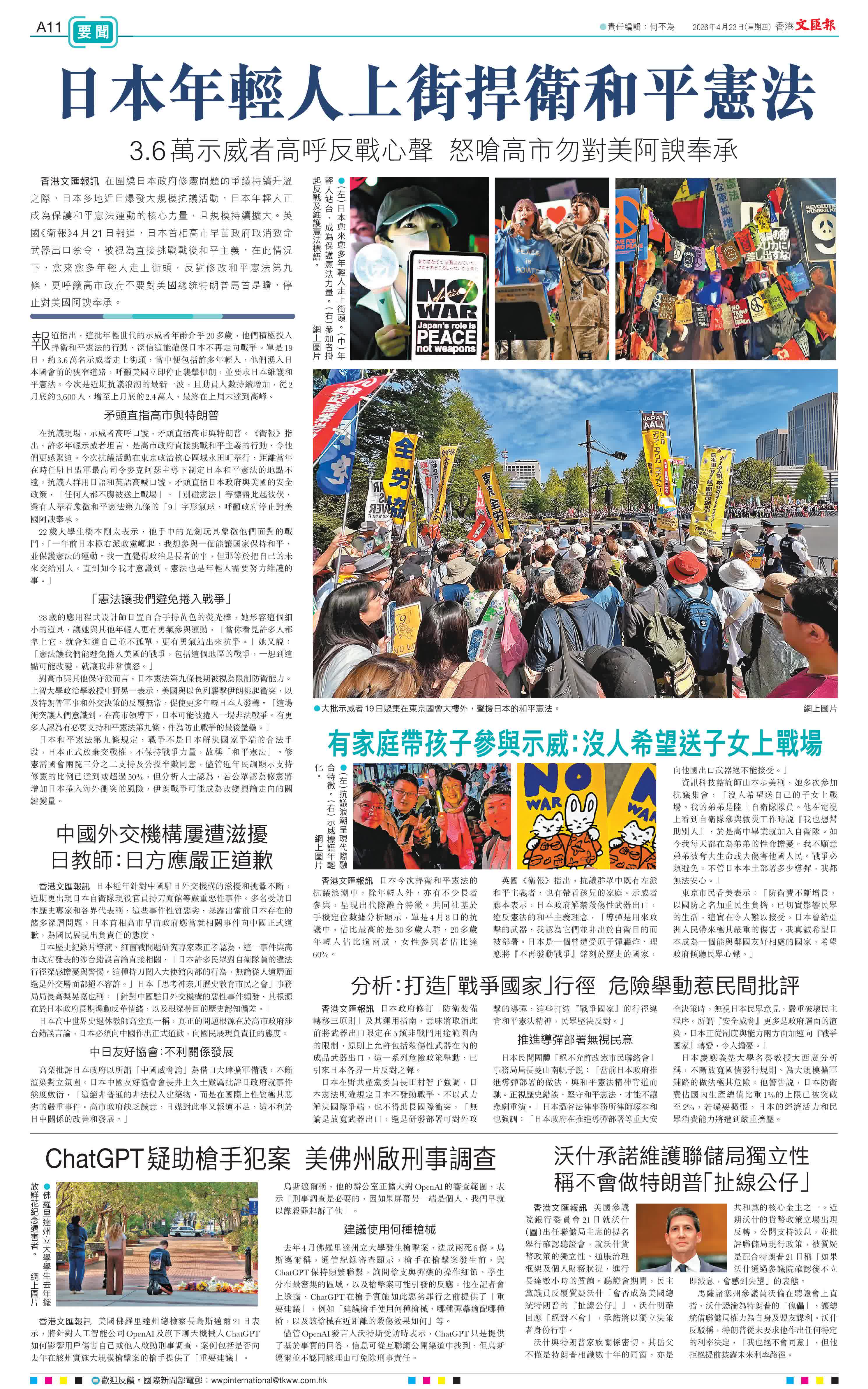 香港文匯報訊 在圍繞日本政府修憲問題的爭議持續升溫之際,日本多地近日爆發大規模抗議活動,日本年輕人正成為保護和平憲法運動的核心力量,且規模持續擴大。英國《衛報》4月21日報道,日本首相高市早苗政府取消致命武器出口禁令,被視為直接挑戰戰後和平主義,在此情況下,愈來愈多年輕人走上街頭,反對修改和平憲法第九條,更呼籲高市政府不要對美國總統特朗普馬首是瞻,停止對美國阿諛奉承。