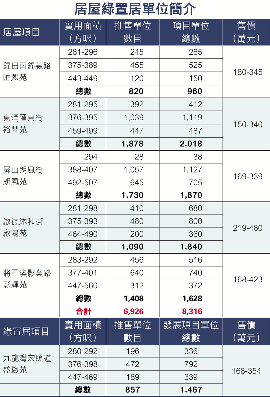 唯一的綠置居項目九龍灣盛緻苑逾800個新單位,實用面積介乎280至469平方呎,售價168萬至354萬元。假設單位售價為270萬元,承造單位售價九成半的按揭、按揭還款期30年,並以現行按揭利率約3.5%計算,申請者每月按揭還款額約為11,500元。
