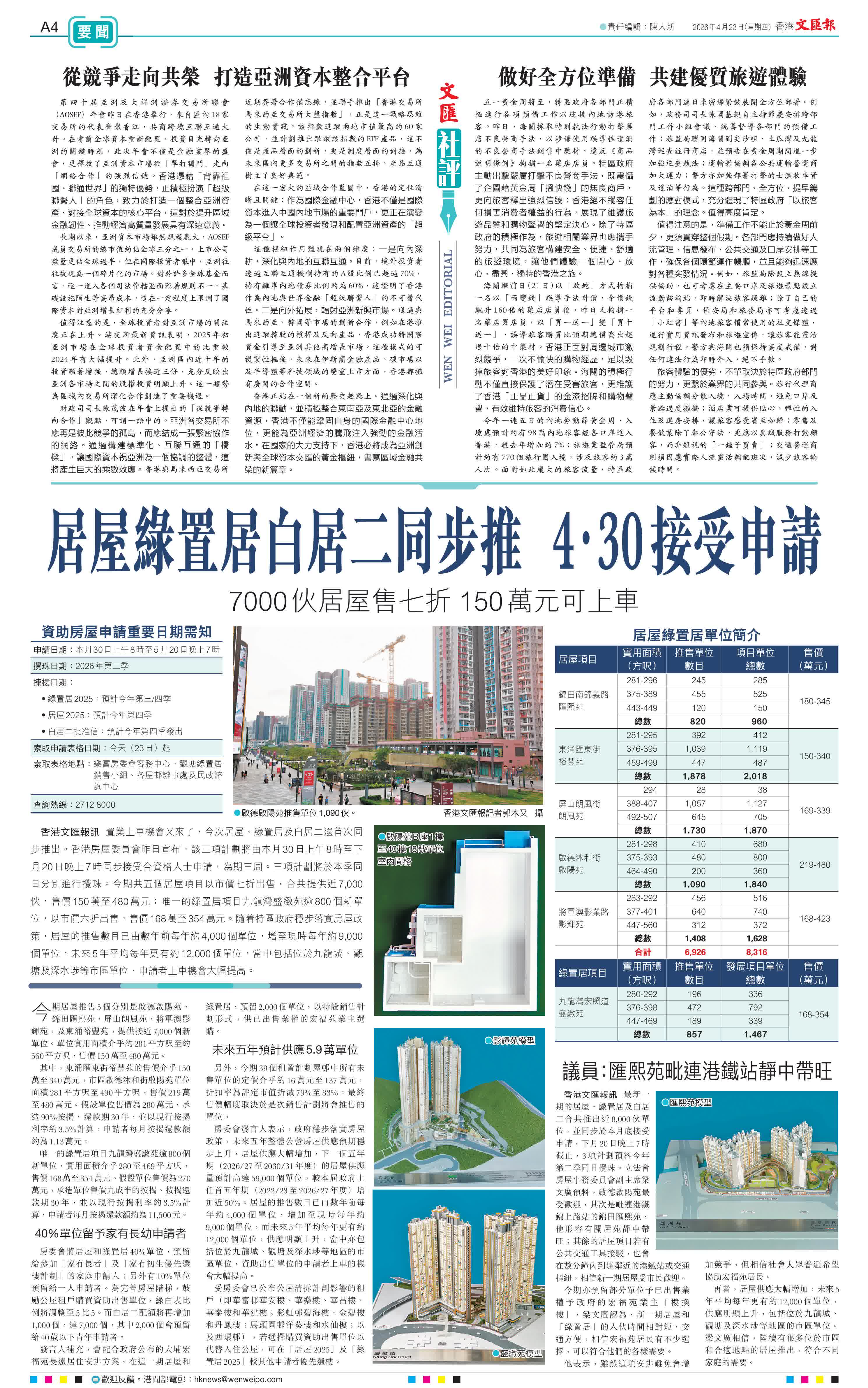 香港文匯報訊 置業上車機會又來了,今次居屋、綠置居及白居二還首次同步推出。香港房屋委員會昨日宣布,該三項計劃將由本月30日上午8時至下月20日晚上7時同步接受合資格人士申請,為期三周。三項計劃將於本季同日分別進行攪珠。今期共五個居屋項目以市價七折出售,合共提供近7,000伙,售價150萬至480萬元;唯一的綠置居項目九龍灣盛緻苑逾800個新單位,以市價六折出售,售價168萬至354萬元。隨着特區政府穩步落實房屋政策,居屋的推售數目已由數年前每年約4,000個單位,增至現時每年約9,000個單位,未來5年平均每年更有約12,000個單位,當中包括位於九龍城、觀塘及深水埗等市區單位,申請者上車機會大幅提高。