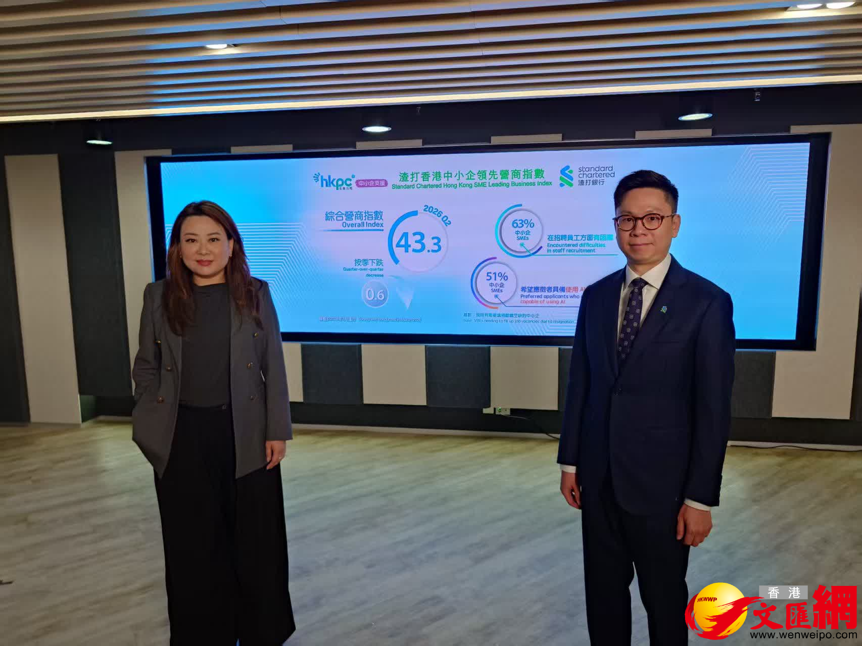 香港文匯報訊(記者 岑健樂)中東局勢持續緊張,導致中小企營商信心轉弱。生產力局今日公布,2026年第二季「渣打香港中小企領先營商指數」由上季43.9,跌至43.3(低於50表示受訪者對前景較為悲觀)。其中,「環球經濟」分項指數由上季的36.4,大跌至今季的20.9。渣打大中華及北亞高級經濟師胡東安表示,相關數字反映中小企營商情緒因為中東局勢緊張與油價上升轉為審慎。