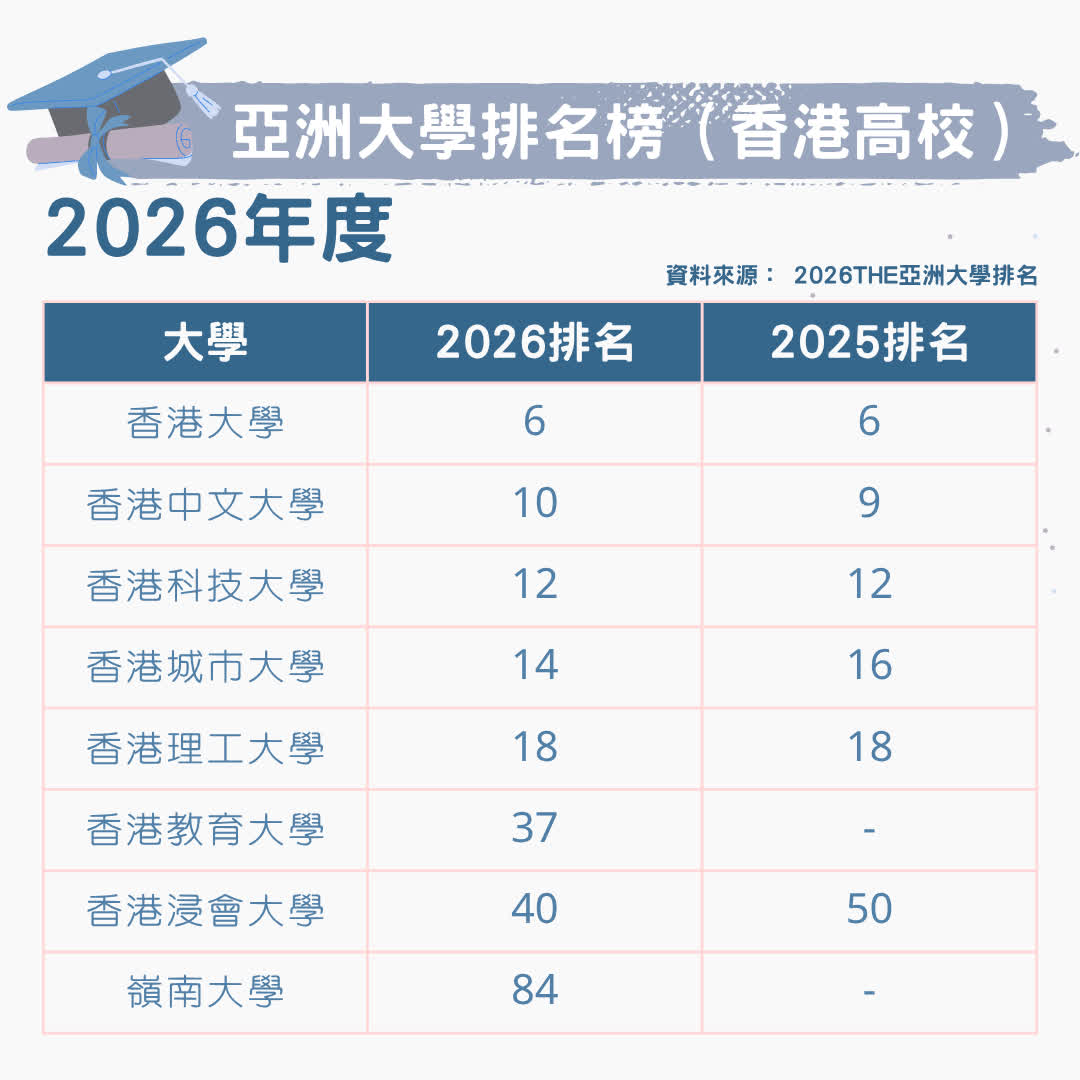 香港文匯報訊(記者 莫楠)統籌教育、科技、人才一體化發展,以提升國家創新體系整體效能,是國家「十五五」規劃戰略重點之一。香港院校憑藉教研實力,於今日公布的2026年度泰晤士高等教育(THE)亞洲大學排名中再傳捷報,共有七所本港院校躋身40強。其中,香港大學連續三年位列第六,穩居全港第一;按升幅計,香港浸會大學上升10位至第四十,為本港院校中進步幅度最大。另香港教育大學及嶺南大學首次上榜即打入百強,教大排名第三十七,首度躋身亞洲50強,進一步加強「留學香港」品牌效應,鞏固香港國際教育樞紐地位。